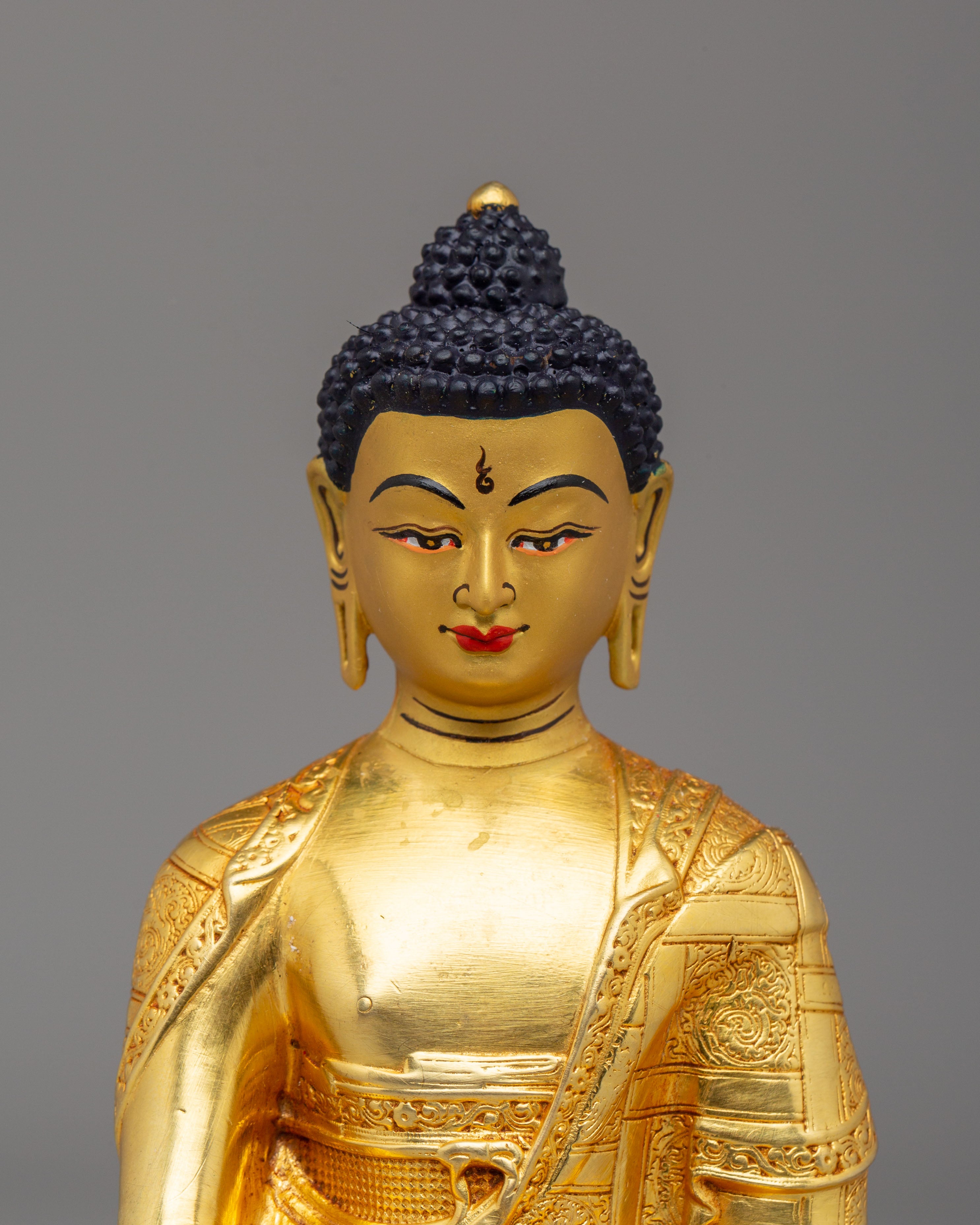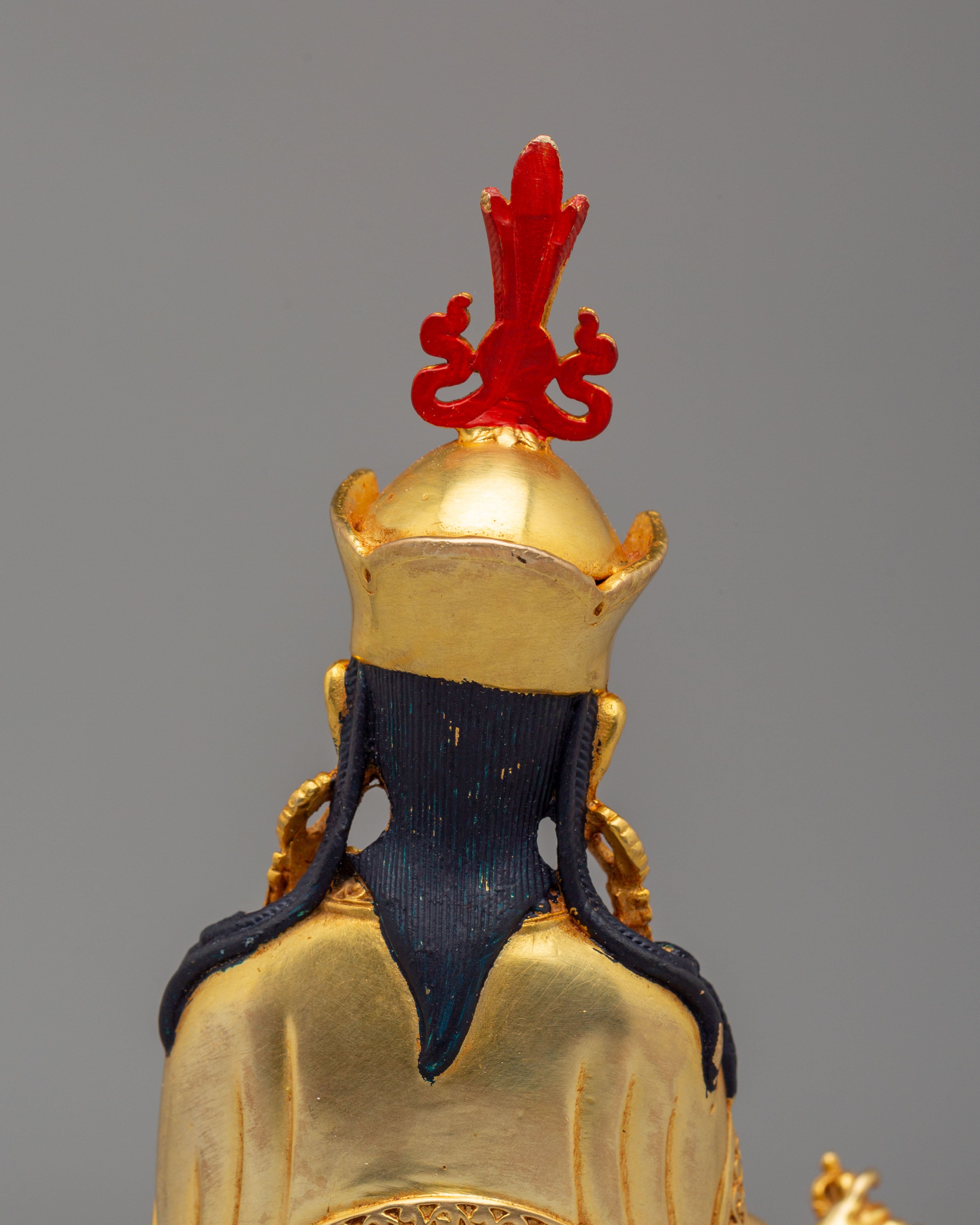 This Handmade Buddha Dharma Sangha Statue Set features three revered figures: Guru Rinpoche, Chenrezig, and Amitabha Buddha. Each statue is crafted from copper and adorned with 24K gold plating, complemented by acrylic color. Guru Rinpoche measures 16 cm in height and 11 cm in width, weighing 0.59 kg. Chenrezig stands at 16.5 cm tall with a 13 cm base, weighing 0.7 kg. Amitabha Buddha measures 16 cm in height and 11 cm in width, weighing 0.8 kg. The total weight of the set is 2.1 kg.