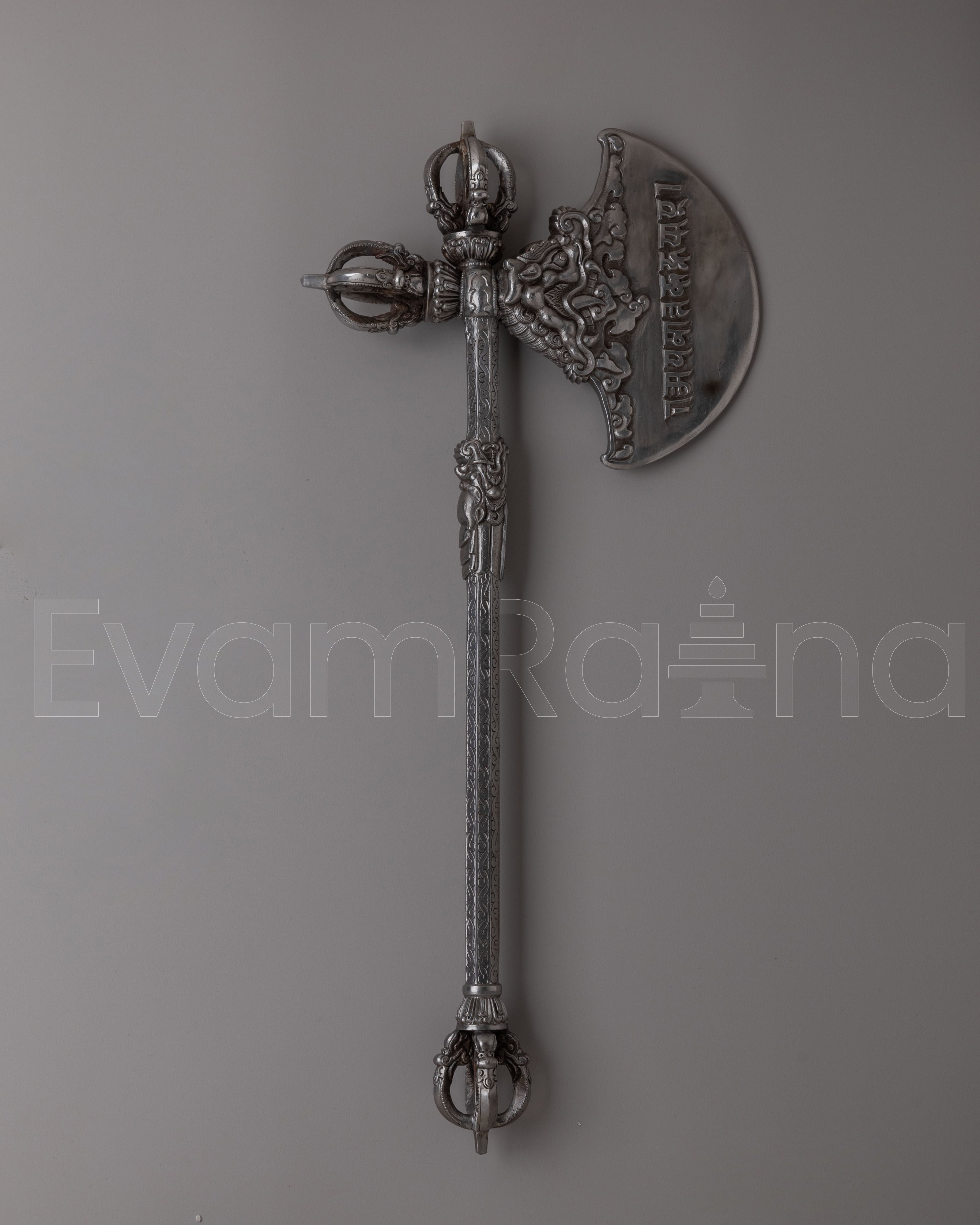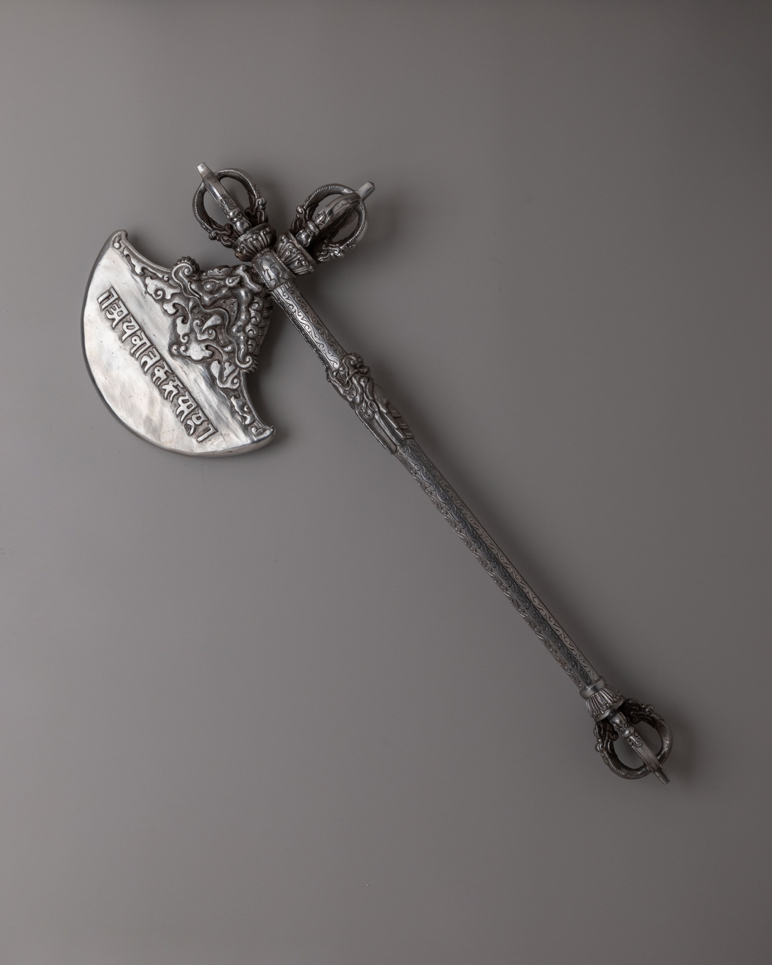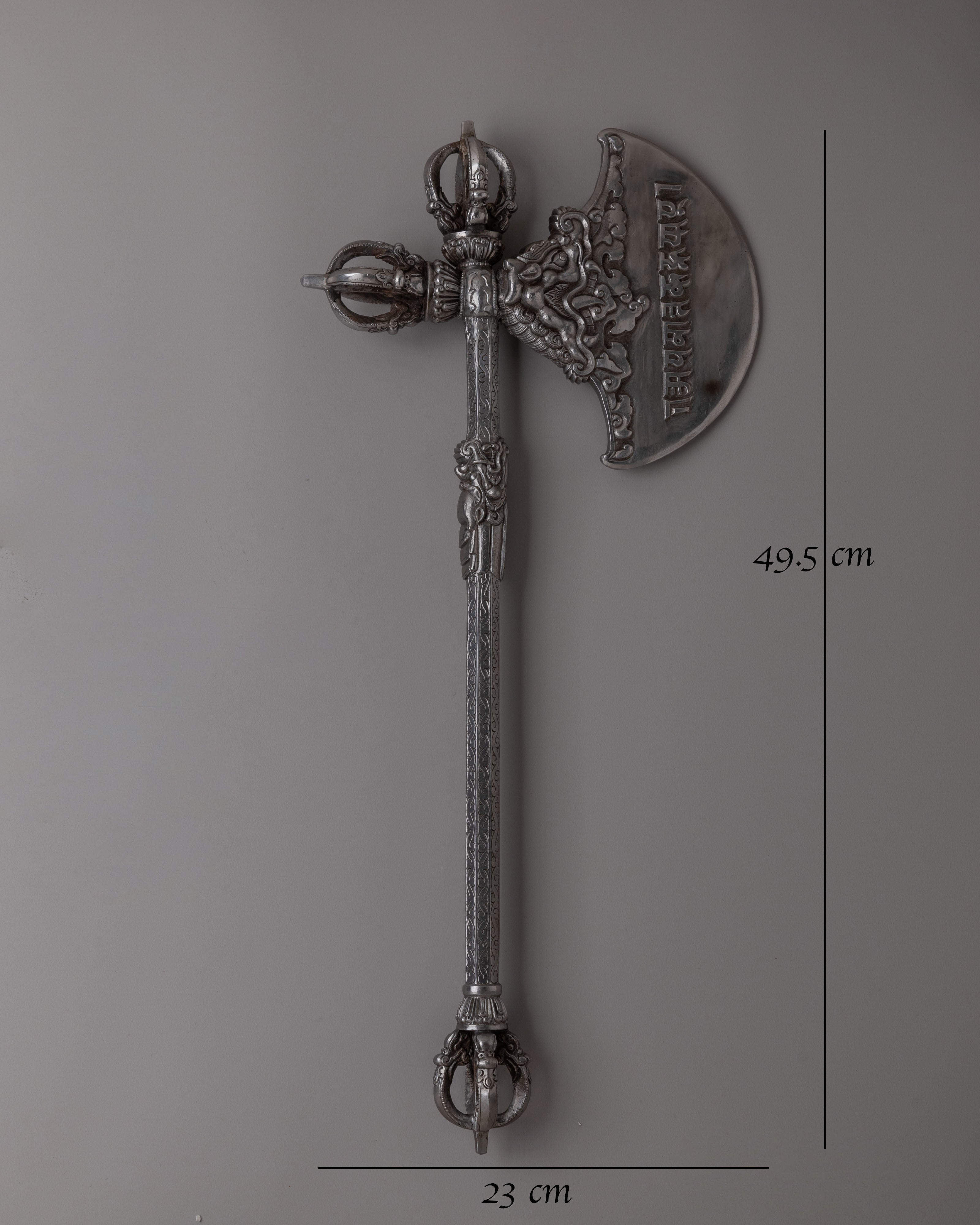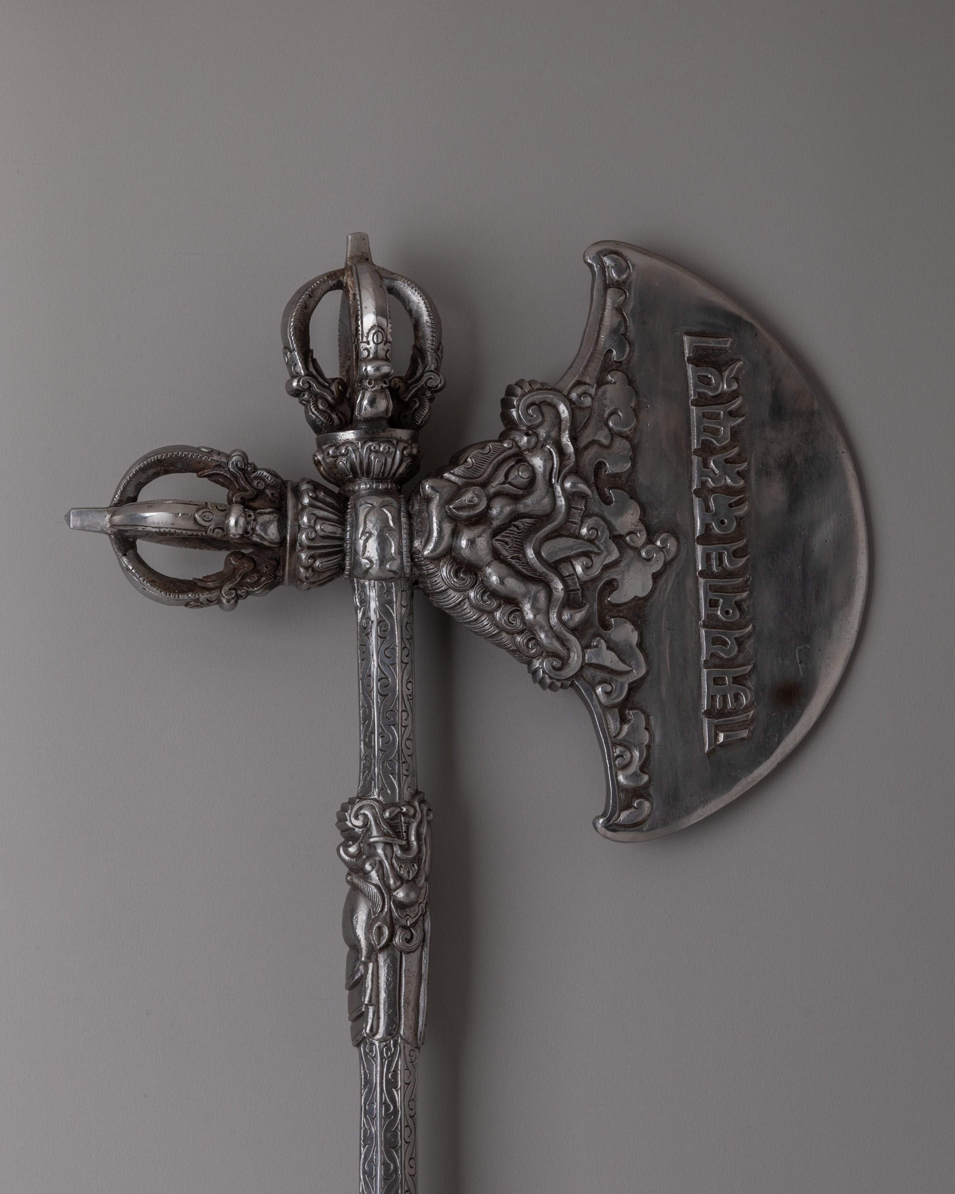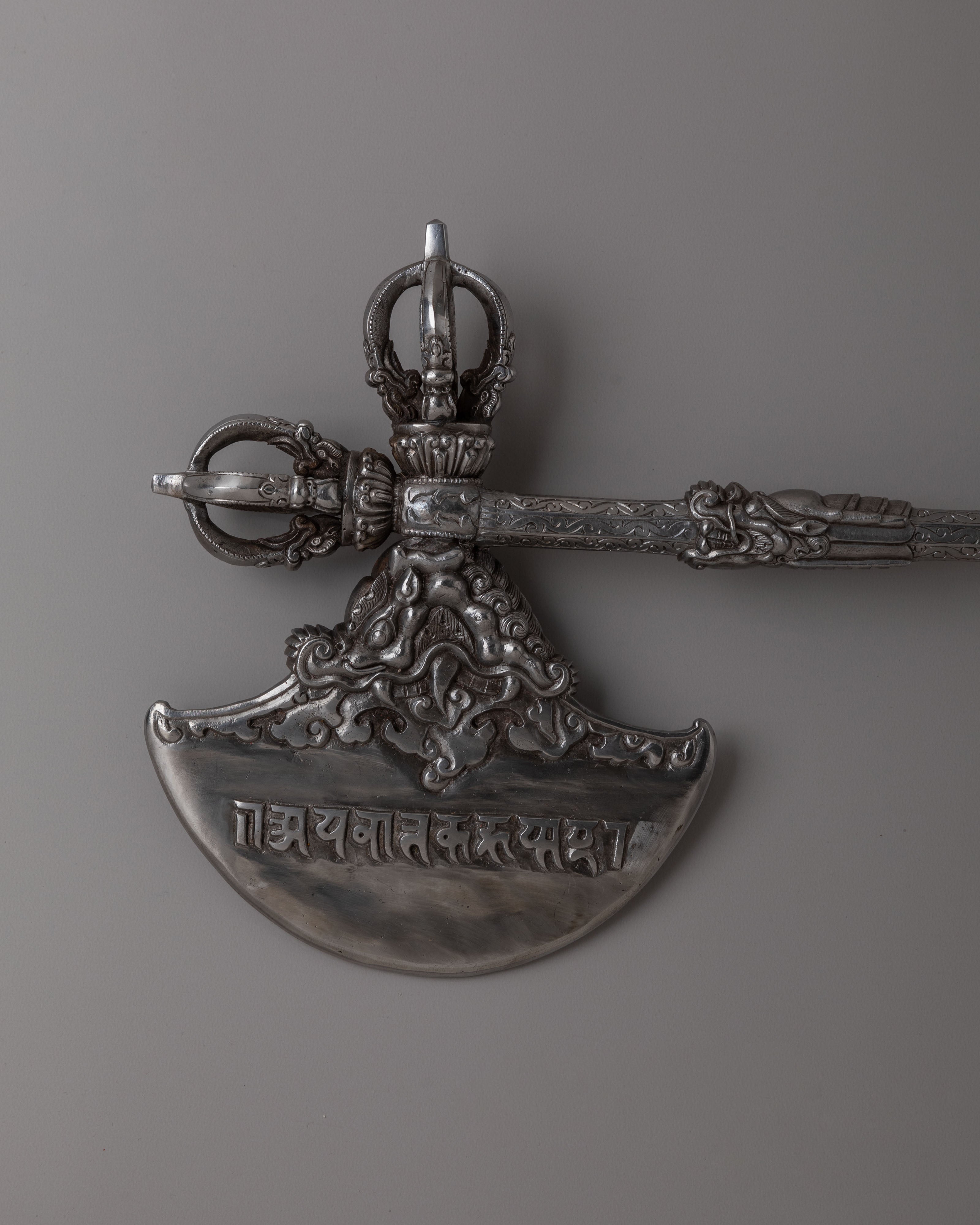 The Tibetan Axe holds deep cultural significance, often associated with protection, purification, and spiritual transformation. Traditionally used in rituals, it embodies the power to overcome obstacles and bring balance to one's life. Beyond its practical use, this axe functions as a decorative object, adding beauty and spiritual meaning to any space. Whether displayed as a centerpiece or used in ceremonial practices, it represents the enduring traditions of Himalayan culture and the sacred symbolism inherent in its craftsmanship.