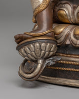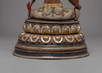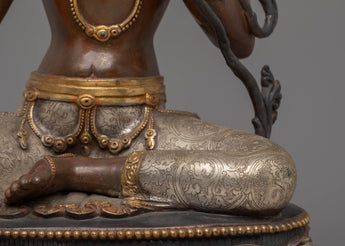 The Sacred Shyama Tara Statue is a meticulously created portrayal of Shyama Tara, Tibetan Buddhism's goddess of protection, compassion, and healing. Standing 46 cm tall, with a 29 cm base and weighing 9.26 kg, this gorgeous statue is composed of copper, finely silver-plated, and 24K gold-gilded to enhance the goddess's divine qualities. This statue, enhanced with acrylic paint to bring out its vibrant details, represents the personification of compassionate energy and is an ideal addition to any altar, sacred area, or meditation room.