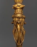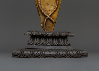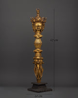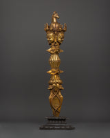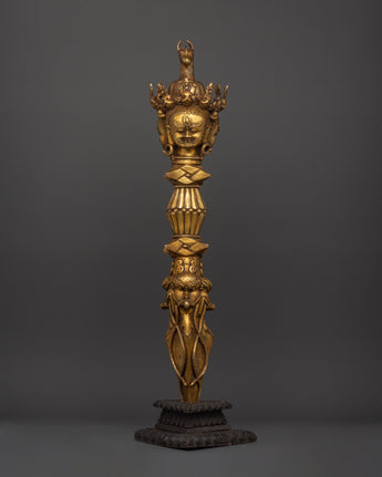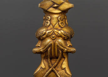 This magnificent Three-Faced Phurba Dagger is an exceptional piece of sacred Tibetan art, designed for both spiritual practice and ritual purposes. Crafted from copper and gold-plated to perfection, this powerful ceremonial dagger features three faces, each symbolizing different aspects of Tibetan Buddhism. The Phurba represents the ability to cut through the illusions and obstacles of the material world, aiding in the transformation of negative energies into positive forces. The three faces atop the Phurba dagger embody various deities or guardians, each watching over the practitioner and offering protection, wisdom, and insight.