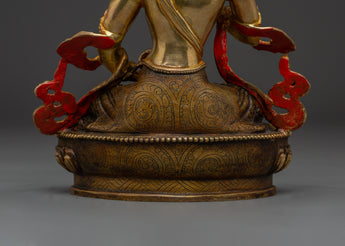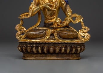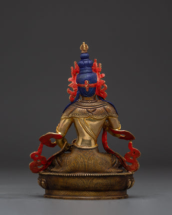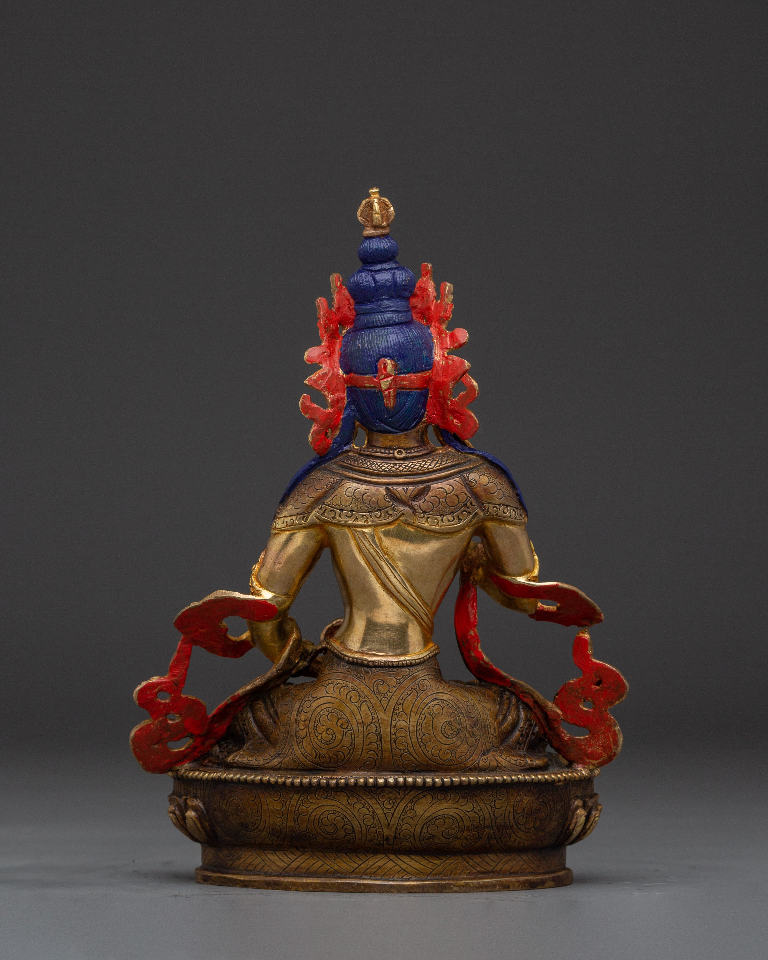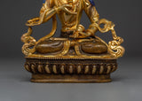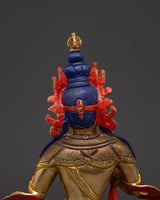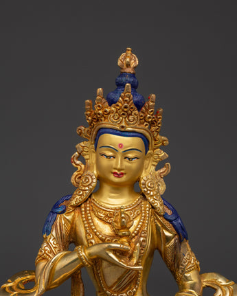 This Buddhist Artwork of Vajrasattva - Deity for Purification, known as a symbol of purity and wisdom, represents spiritual purification and the removal of obstacles on the path to enlightenment. This handcrafted statue, measuring 8.7" (Height) x 6.1" (Base) and weighing 1.28 kg, is made of Copper Body and adorned with hand-carved gemstones and 24K gold gilding, as well as acrylic paint work. Crafted by expert Nepalese artisans, this sacred item embodies the rich traditions of Himalayan Buddhism, making it an important addition to altars, meditation areas, or sacred collections.