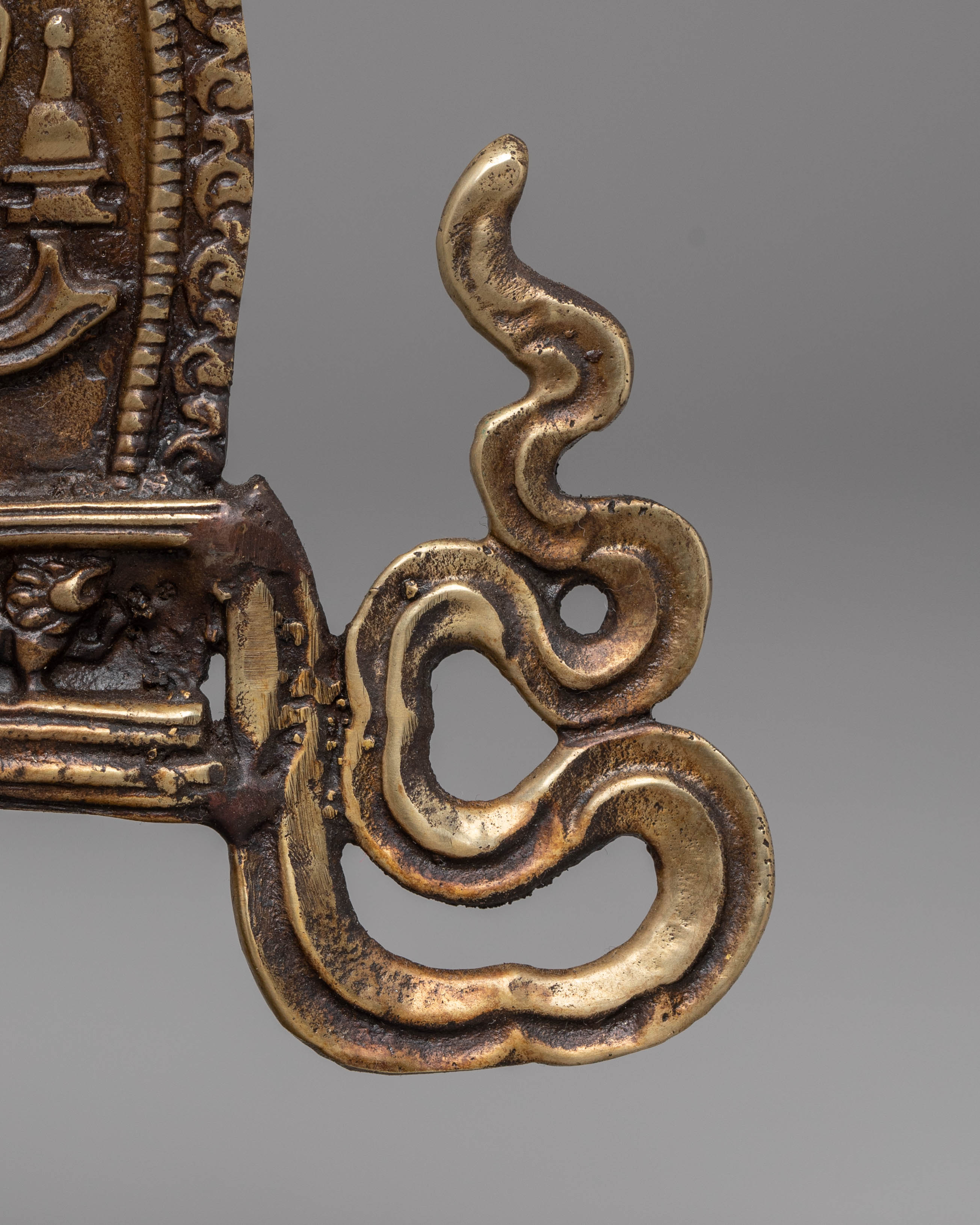 This Buddhist-inspired deity decorative statue is crafted from brass and designed to serve as an elegant piece of spiritual décor for any room. The central deity is framed within a beautifully carved arch, creating a striking focal point perfect for shelves, console tables, and meditation spaces. Its warm brass finish enhances its artistic appeal, allowing it to blend seamlessly into both traditional and modern interior styles.