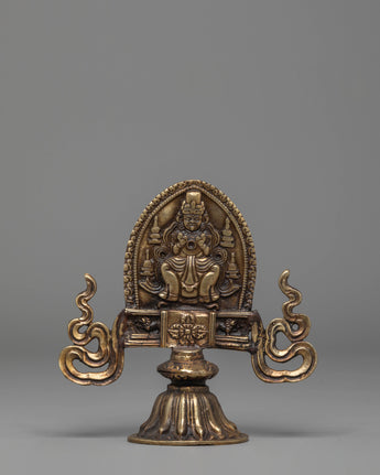 The flowing, flame-like shapes on each side add sculptural movement, giving the décor piece a dynamic, expressive presence. Detailed carvings around the deity and along the base showcase classical Himalayan artistry, offering both visual texture and cultural depth. The lotus-style pedestal provides a refined decorative touch, connecting the piece to themes of harmony, inner peace, and spiritual expression.