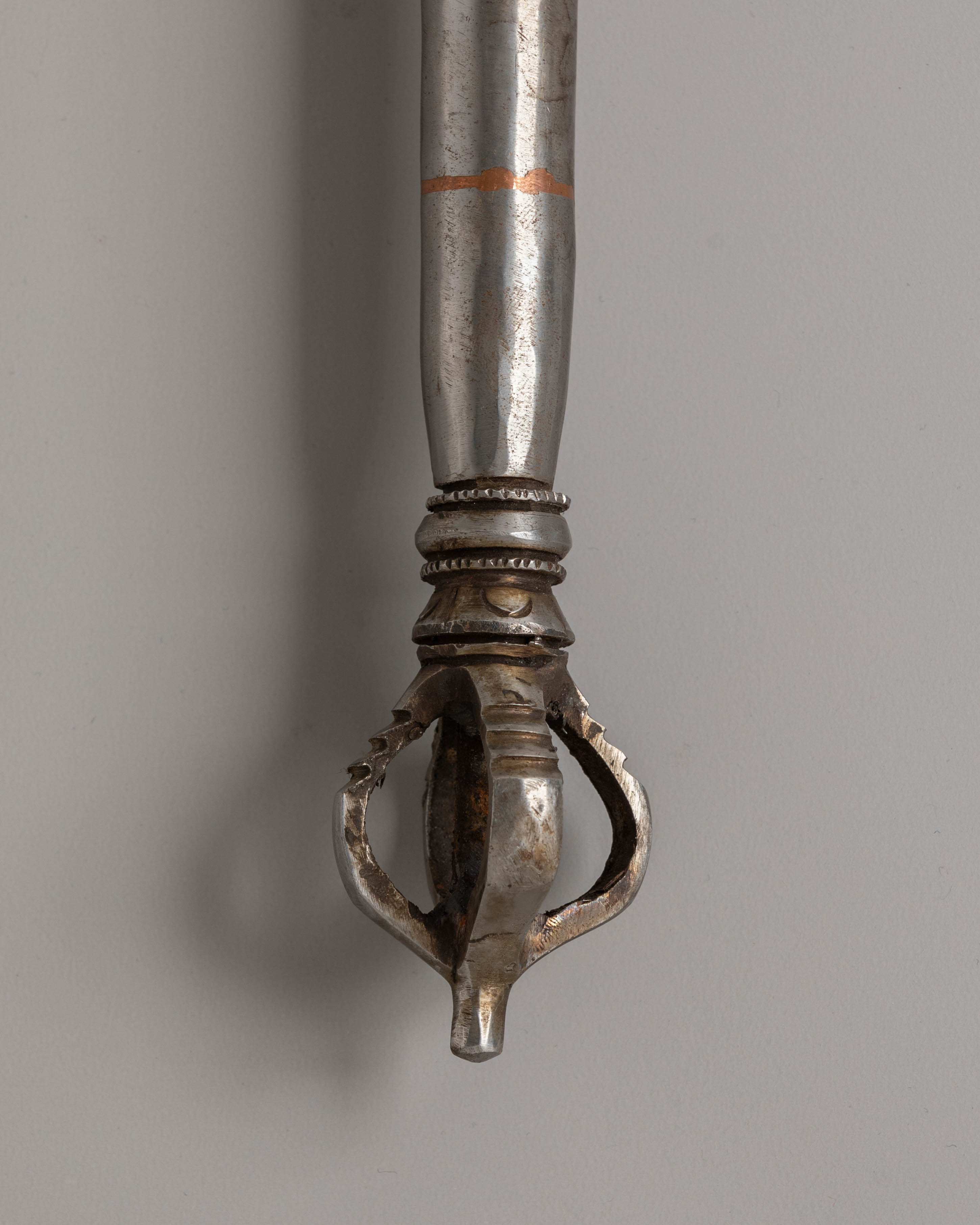 The handle features the classic vajra form at both ends, representing indestructible wisdom and the stability of awakened insight. The workmanship displays traditional Himalayan metal artistry, with a smooth iron shaft and a crescent blade that enhances the piece's presence. Its balanced proportions, symbolic motifs, and ritual purpose make it a visually compelling object for personal practice, meditation spaces, and ceremonial settings.