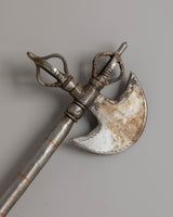 The khatvanga, also spelled "khadga" or "khadgaṅka," is a ritual tool used in Tibetan Buddhism and other Vajrayana traditions. It is commonly referred to as a symbolic or ritual axe. The khatvanga is typically made of a long shaft with three severed heads arranged in a triangular pattern at the top. In Buddhism, each head symbolizes overcoming the ego and the three poisons. The khatvanga is associated with several deities, including Chakrasamvara and Vajrayogini. Practitioners incorporate it into ceremonies and rituals as a spiritual tool for cutting through ignorance and attachment, promoting enlightenment and the realization of emptiness.