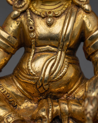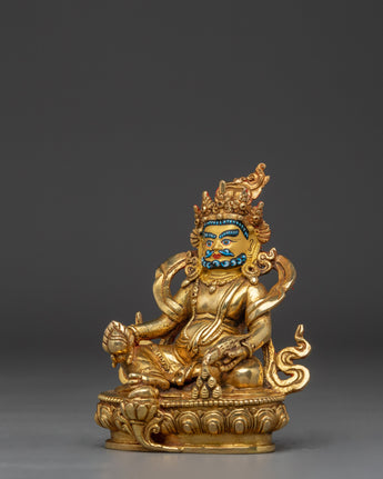 This Dzambhala Kubera Figurine, the Buddhist deity of wealth and success, radiates divine assurance and great wealth. This stunning sculpture, which measures 5.1" (Height) x 3.9" (Base) and weighs 0.60 kg, is hand-crafted from a copper body, gilded with 24K gold, enhanced with complex gold and acrylic paints, and adorned with hand-carved gemstones. Professional Nepalese artisans created it, representing the sacred artistry of Himalayan workmanship, making it an exceptional centerpiece for altars, meditation spaces, and holy collections.