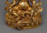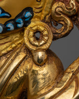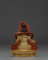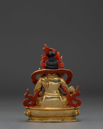 Dzambhala is depicted in a seated position, holding a mongoose in his left hand to symbolize the removal of material and spiritual obstacles. In contrast, his right hand rests in the Granting Mudra with Citron Fruit. His crown, encrusted with magnificent gems, symbolizes the prosperity and plenty he bestows on his disciples. The royal throne, richly decorated with engraved carvings and hand-carved gemstones, and elevated on a base, embodies a sense of reverence, power, and serenity. Dzambhala's strong yet sympathetic visage reminds practitioners of his protective nature and capacity to alleviate poverty by providing spiritual and practical gifts.