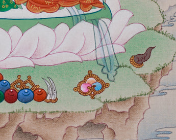 Radiant in divine elegance, the Chenrezig, the god of universal compassion, is a beautifully hand-painted thangka depicting Avalokiteshvara, the Buddha of Infinite Mercy. Created on cotton canvas using natural stone colors and 24K gold, it reflects exceptional artistry and spiritual devotion. The green background adds warmth and a glow, emphasizing Chenrezig's serene presence. Each brushstroke is carefully applied in the traditional Karma Gadri style, known for its elegant proportions, open composition, and detailed craftsmanship. The vibrant colors combined with luminous gold outlines produce a mesmerizing glow, making it a perfect addition to any sacred or meditative space.