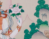 Chenrezig, also known as Avalokiteshvara, is a highly revered bodhisattva in Tibetan Buddhism, embodying universal compassion. It is believed that all Buddhas manifest through him to alleviate the suffering of sentient beings. In this thangka, Chenrezig is depicted with four arms, illustrating his limitless capacity to assist beings in all directions. His upper hands hold a lotus flower and a crystal mala—symbols of purity and boundless compassion—while his lower hands are joined in prayer at his heart, emanating love and serenity. He is seated on a vibrant lotus throne, surrounded by blooming lotuses and soft shades of green and orange, symbolizing enlightenment emerging from illusion. This Chenrezig painting embodies love and mindfulness, making it an ideal meditation aid or spiritual focal point for the home.