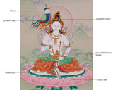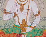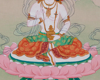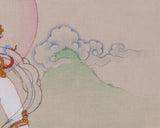 Mandarva, the revered companion of Guru Rinpoche, is depicted seated on a lotus throne above a moon disc, symbolizing her wisdom and purity. She holds a nectar-filled vase, representing vitality and healing, and wears a five-jeweled crown that signifies her spiritual authority. The five colored silks symbolize the five elements, while the mirror reflects her enlightened nature. The background showcases vibrant scenery, emphasizing her close bond with both nature and spirituality. This thangka is ideal for deepening your spiritual practice or enhancing your sacred space. It serves as a reminder of the transformative power of devotion, wisdom, and feminine energy.