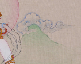 Experience the divine presence of the Dakini Mandarva Painting, created on high-quality cotton canvas with natural stone colors and genuine 24K gold. This thangka showcases the delicate brushwork and vibrant colors characteristic of the traditional Karma Gadri style. It captures Mandarva's grace, power, and purity, making it a beautiful spiritual treasure and a meditation object.