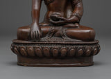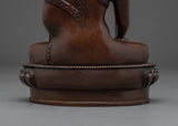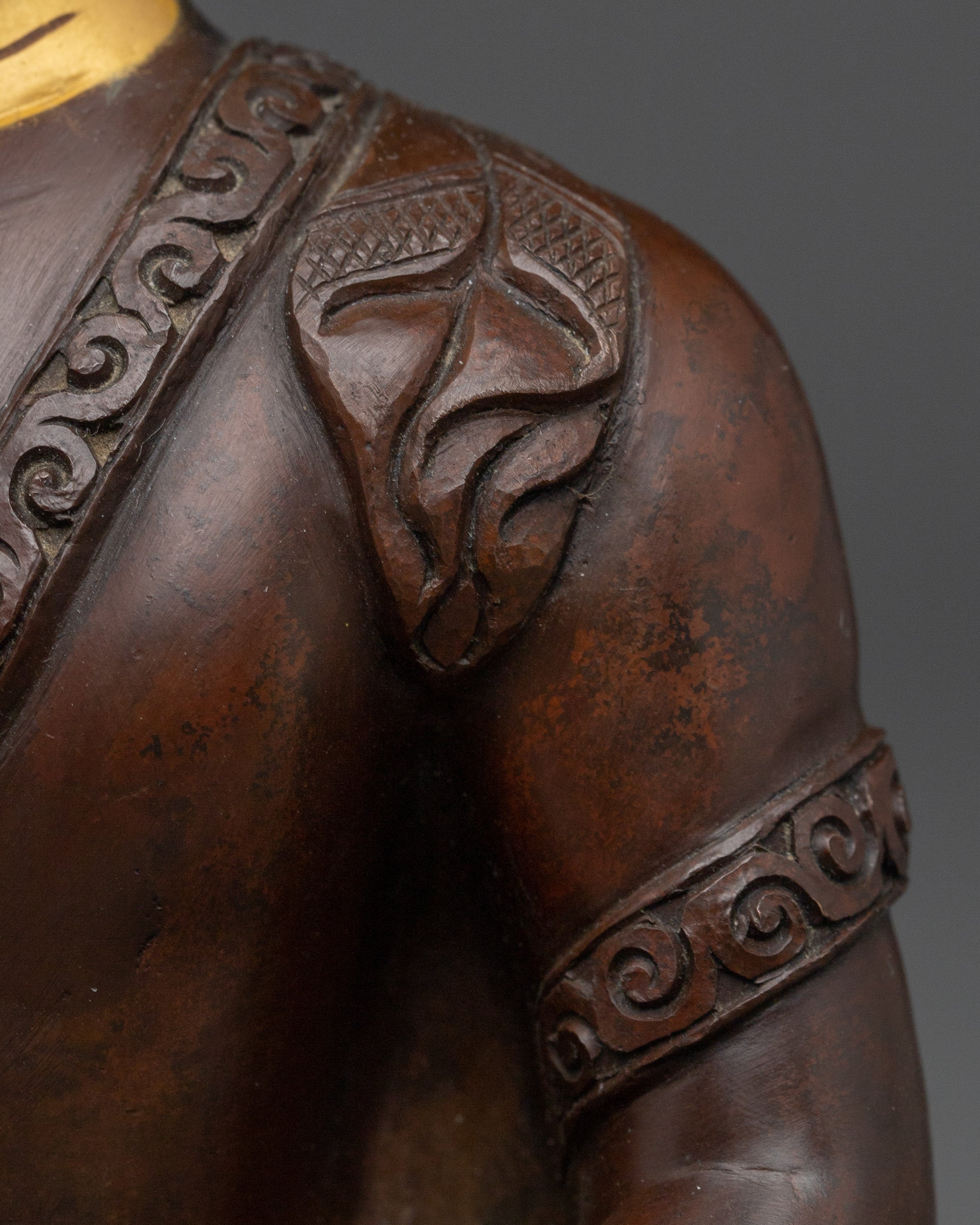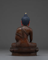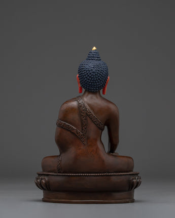 Dharma Teacher Siddhartha Gautama measures 8.7” (22cm) in height and 5.9” (15cm) at the base, weighing 1.38 kg. Crafted from an oxidized copper body, it features delicate acrylic paintings that enhance its intricate details. This piece reflects traditional Tibetan Buddhist artistry, making it a meaningful addition to any meditation altar or spiritual space.
