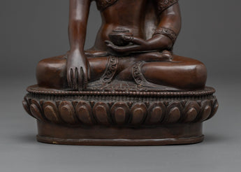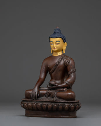 Shakyamuni Buddha is depicted sitting in the lotus pose (padmasana), indicating his steady concentration and mastery over the distractions of the material world. His right hand stretched toward the earth in bhumisparsha mudra, representing his moment of enlightenment, inviting the earth to witness his waking. The left hand, lying gently in his lap in dhyana mudra holding an alms bowl, depicts the profound state of meditation and mindfulness that leads to insight and clarity.