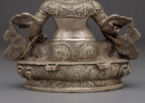Dzambhala is depicted in a sitting position, holding a mongoose in his left hand to symbolize the removal of material and spiritual obstacles. In contrast, his right hand rests in the Granting Mudra with Citron Fruit. Dzambhala's strong yet sympathetic visage reminds practitioners of his protective nature and capacity to alleviate poverty by providing spiritual and practical gifts.