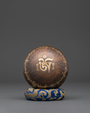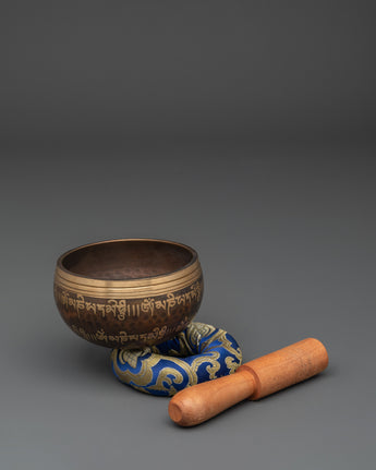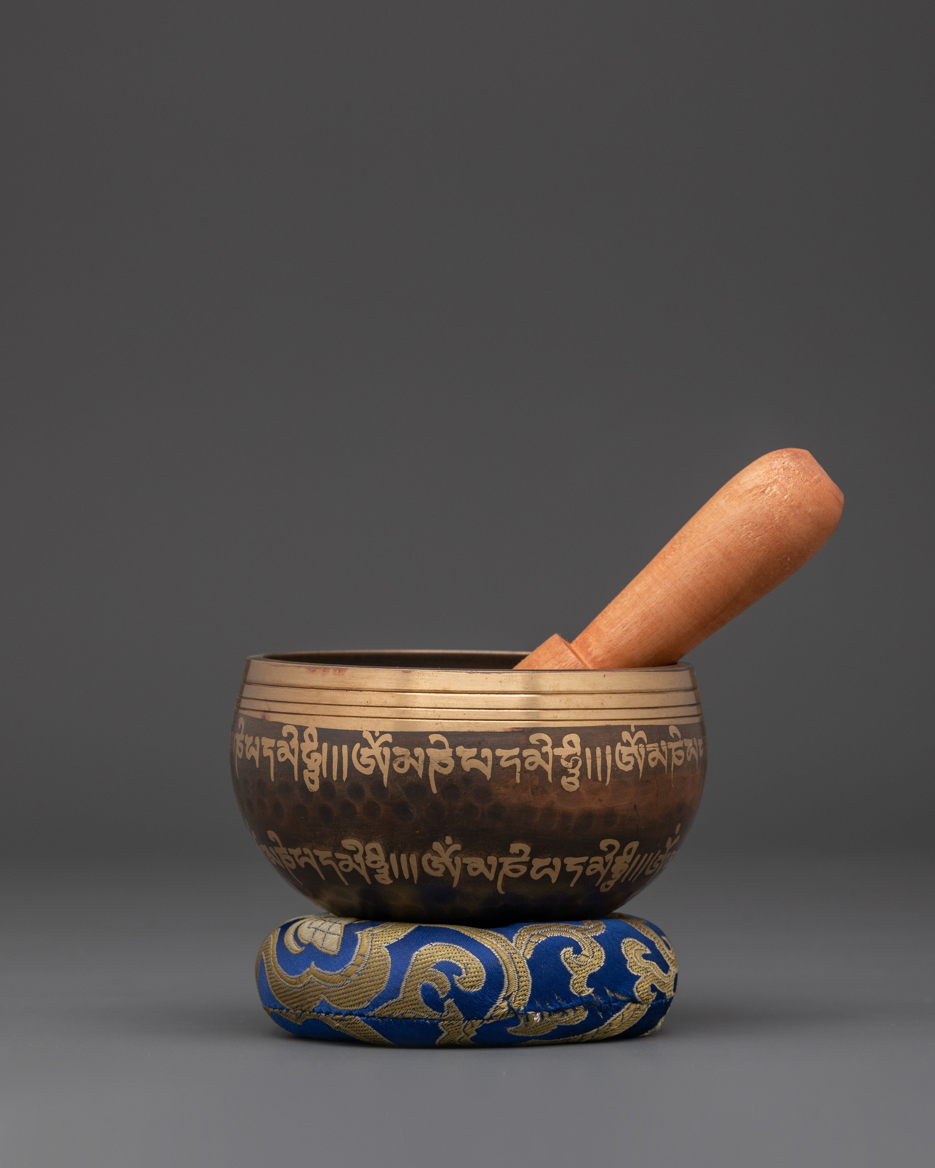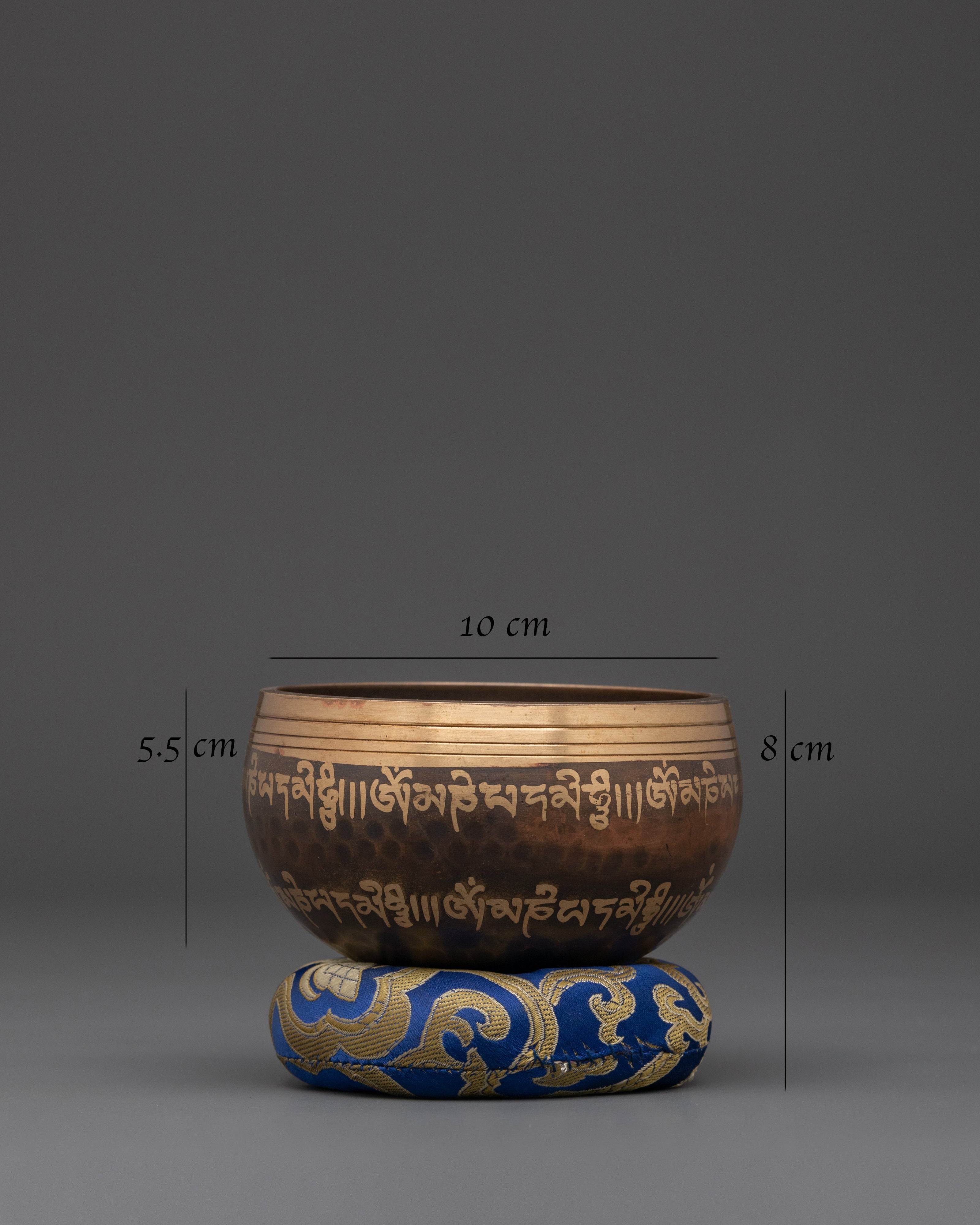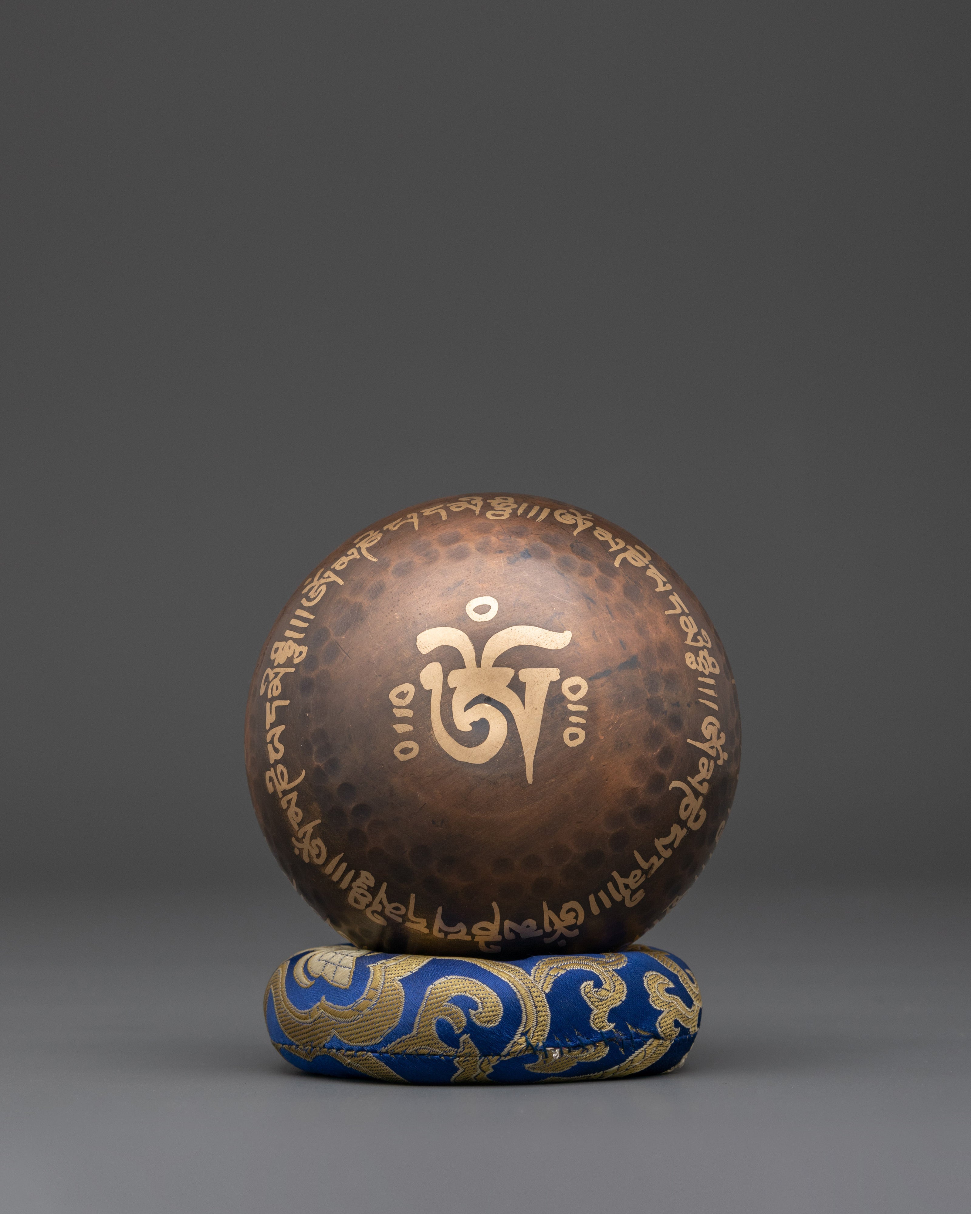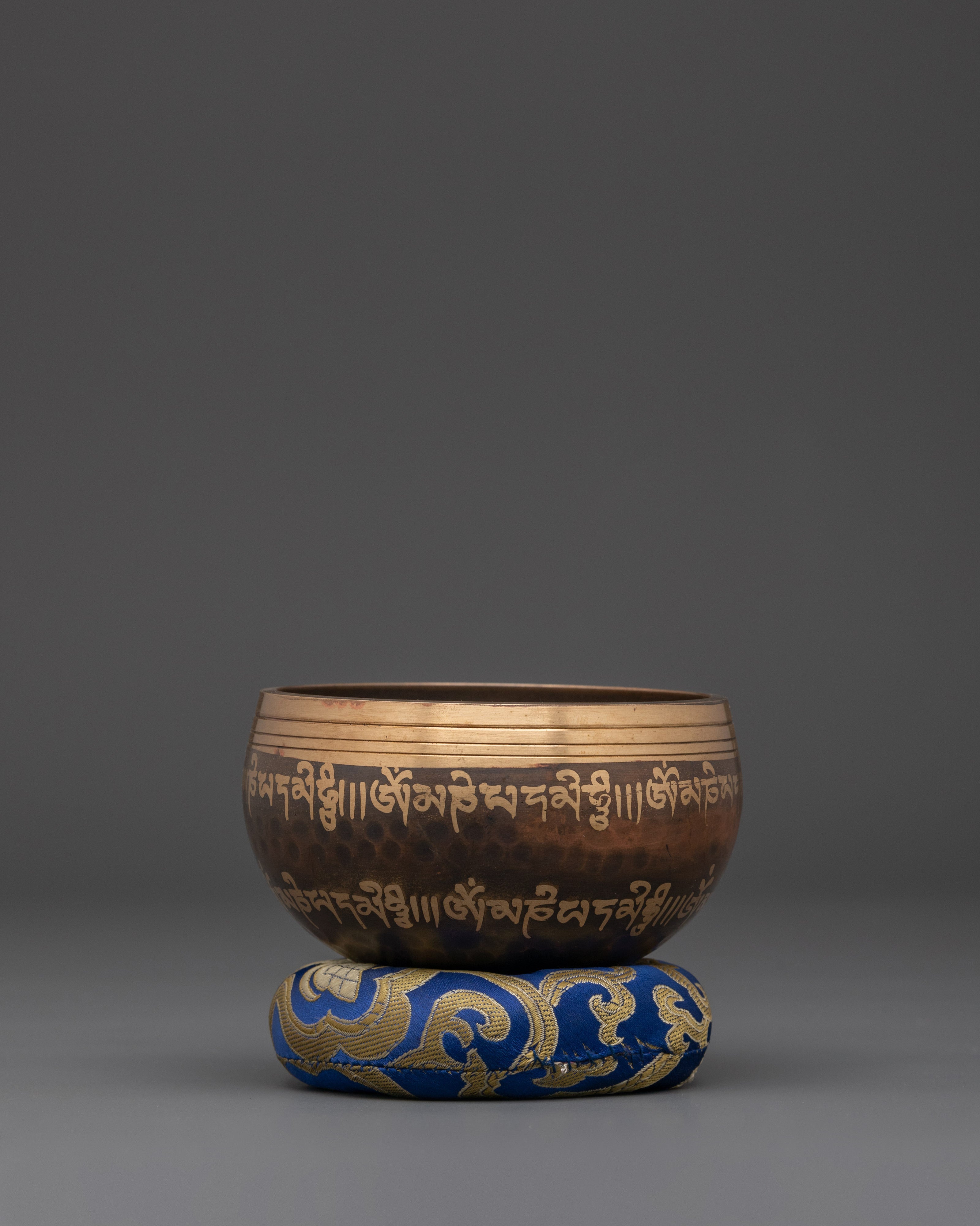 The bowl, beautifully etched with the sacred mantra "Om Mani Padme Hum," emits spiritual energy that purifies the surroundings and brings peace into your area. The warm bronze tone and hand-hammered texture highlight the authenticity of Himalayan artistry, while the intricate etchings represent Buddhist teachings of compassion and enlightenment. It sits firmly on an embroidered blue cushion and serves as an exquisite display piece for your house or meditation altar.