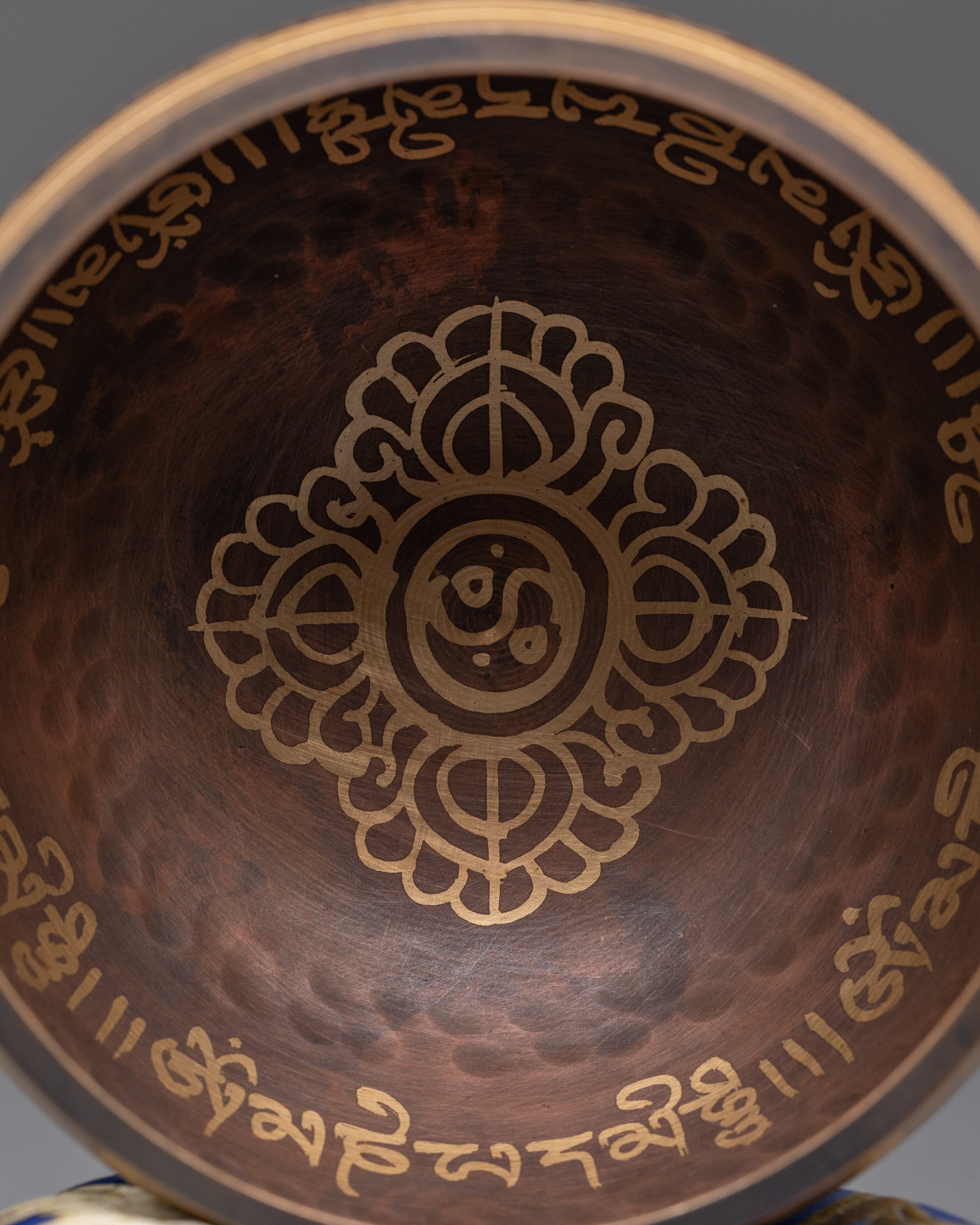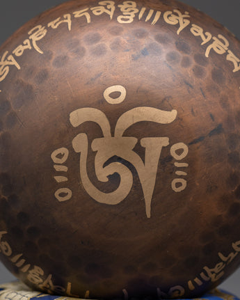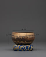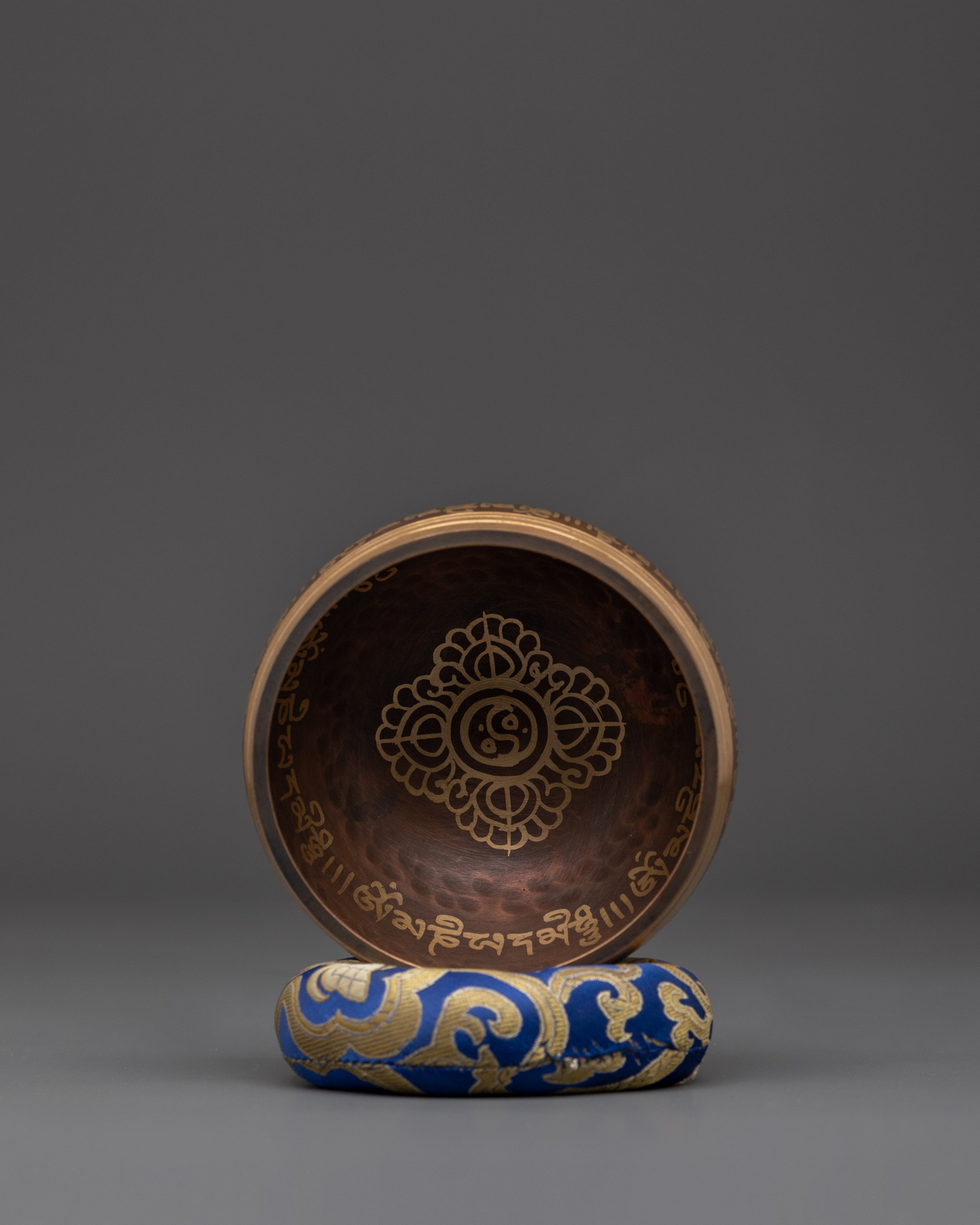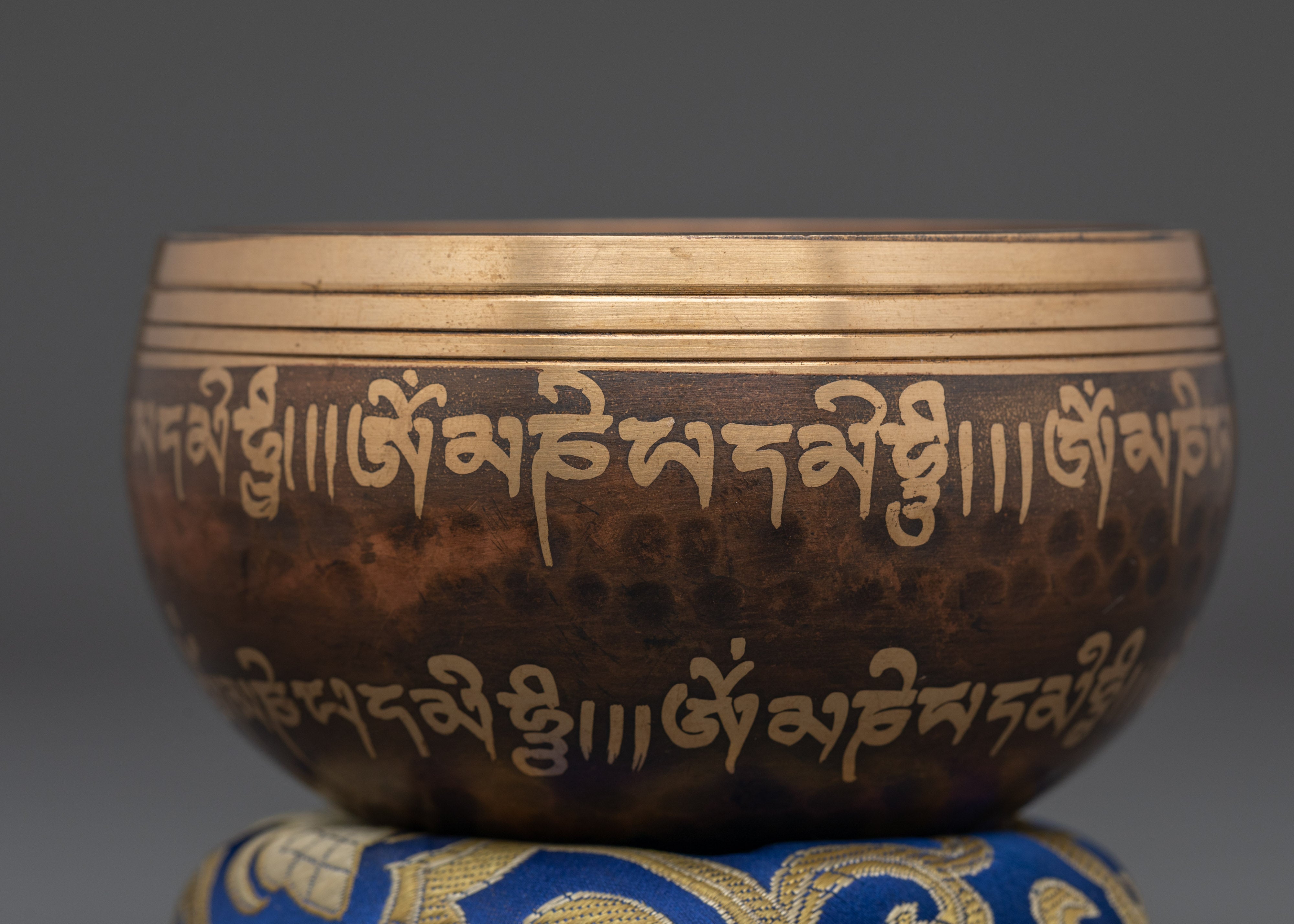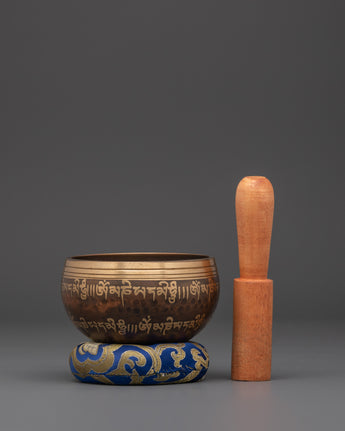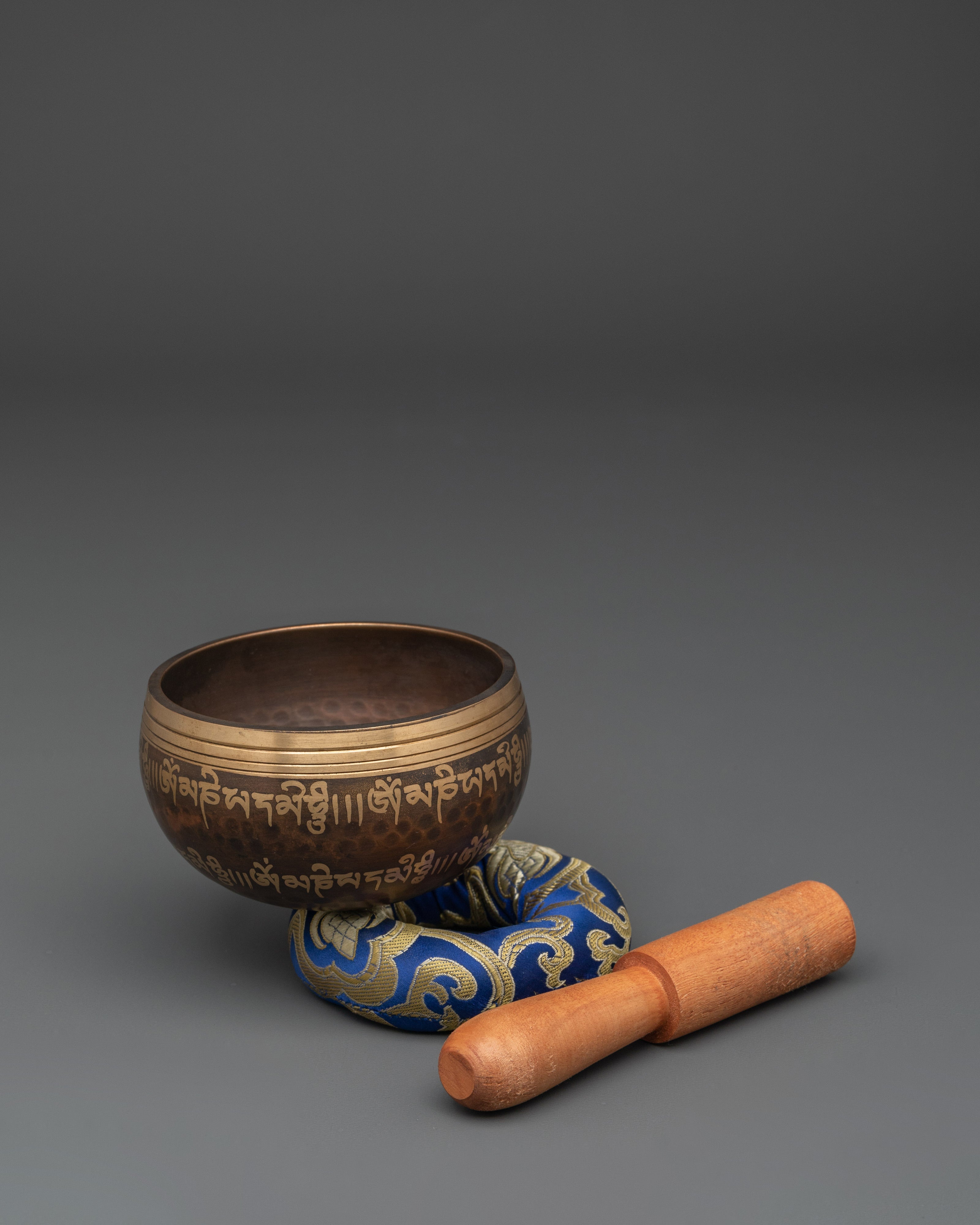 The bowl, beautifully etched with the sacred mantra "Om Mani Padme Hum," emits spiritual energy that purifies the surroundings and brings peace into your area. The warm bronze tone and hand-hammered texture highlight the authenticity of Himalayan artistry, while the intricate etchings represent Buddhist teachings of compassion and enlightenment. It sits firmly on an embroidered blue cushion and serves as an exquisite display piece for your house or meditation altar.