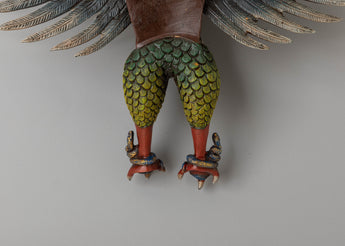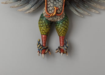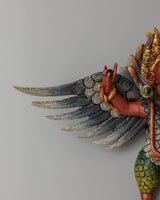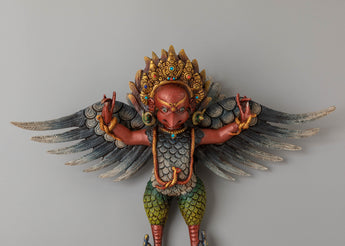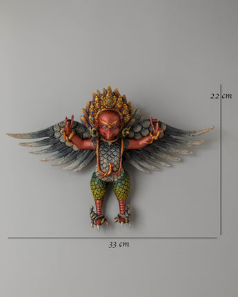 The design of the Garuda Wall Hanging features an intricately detailed Garuda figure with expansive wings and a regal crown, symbolizing his divine status. The gold accents on the crown and wings enhance its sense of majesty. The addition of gemstones around the figure, along with the acrylic colors used in the feathers and body, gives the sculpture a radiant and dynamic look. The Garuda is depicted in a powerful pose, representing protection, courage, and the removal of obstacles, making it an ideal piece for a spiritual altar or sacred space.