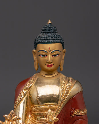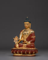 This Supreme Healer Medicine Buddha Statue, also known as the King of Lapis Lazuli Light, measures 8.5”/21.5cm in height and 5.9”/15cm at the base and weighs 1.47 kg. Crafted from copper with 24K gold gilding and featuring detailed gold and acrylic paintings, this statue embodies the powerful healing qualities and compassionate energy of the Medicine Buddha. Expertly handcrafted by skilled Nepali artisans, it is a meaningful addition to altars, meditation spaces, or healing-focused spiritual collections.