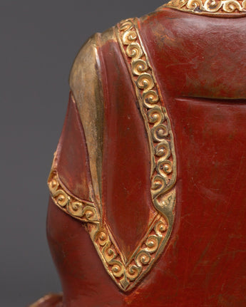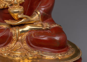 Medicine Buddha, revered as the Supreme Healer in Tibetan Buddhism, embodies the curative power of enlightened compassion. He is shown seated peacefully in vajrāsana on a lotus and moon disc base, symbolizing purity and detachment from worldly pain. His right hand is extended in the gesture of giving, holding the myrobalan plant—a sacred herb in Tibetan medicine known for its potent healing properties. His left hand, resting in his lap in dhyāna mudrā (the meditation gesture), holds a bowl filled with healing nectar, representing the spiritual remedy that addresses the root causes of suffering: ignorance, attachment, and aversion. His calm expression reflects deep inner tranquility, while the uṣṇīṣa atop his head signifies his fully awakened wisdom. Adorned with traditional sacred ornaments, Medicine Buddha's depiction is a profound symbol of physical well-being and spiritual liberation.