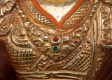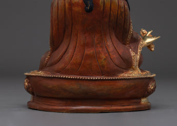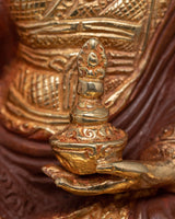 This Lotus-born Guru Rinpoche—Teacher of Tantra, also known as Padmasambhava—measures 10.4”/26.5cm in height and 5.5”/14cm at the base and weighs 1.18 kg. This statue embodies refined craftsmanship, made from copper with 24K gold gilding and detailed gold and acrylic paintings. Expertly created by skilled Nepali artisans, it is a meaningful addition to altars, meditation spaces, or personal spiritual collections.