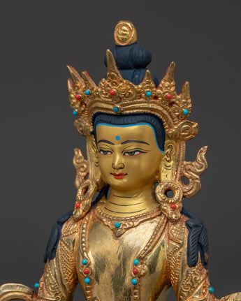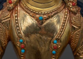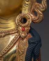 Experience the exquisite elegance of the Amitayus Buddhist Copper Statue, the Buddha of Infinite Life, as captured by this masterfully handmade statue. It stands 8.9 inches tall and has a copper body that has been beautifully gilded with 24K gold. It is embellished with skillfully placed jewels and intricate acrylic paintings. This statue is more than just art; it's a holy symbol of longevity, strength, and spiritual enlightenment that will enhance your meditation room or shrine.