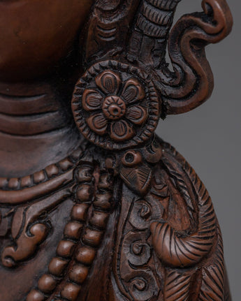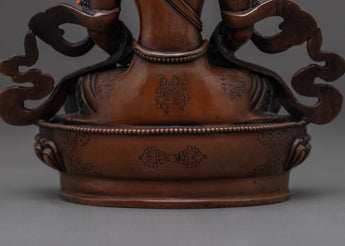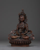 This oxidized, handcrafted Buddha Amitayus statue, also known as the Buddha of Infinite Life, measures 8.8”/22.5cm in height and 6.8”/17.5cm at the base, weighing 1.47 kg. Made from oxidized copper and adorned with gemstones, it features a refined, aged finish that enhances its spiritual presence. Expertly crafted by skilled Nepali artisans, it symbolizes longevity and vitality, making it a meaningful addition to compact altars, meditation spaces, or personal spiritual collections.