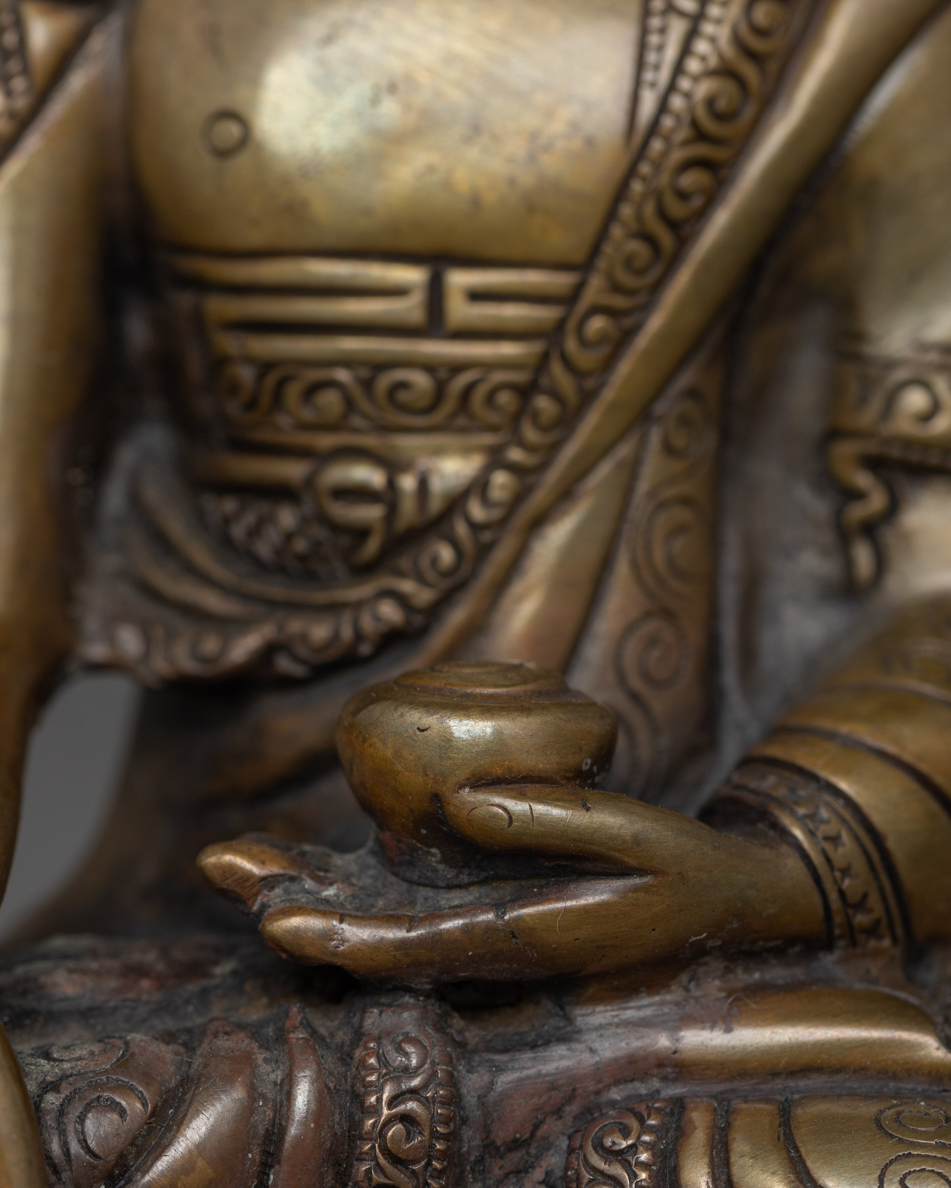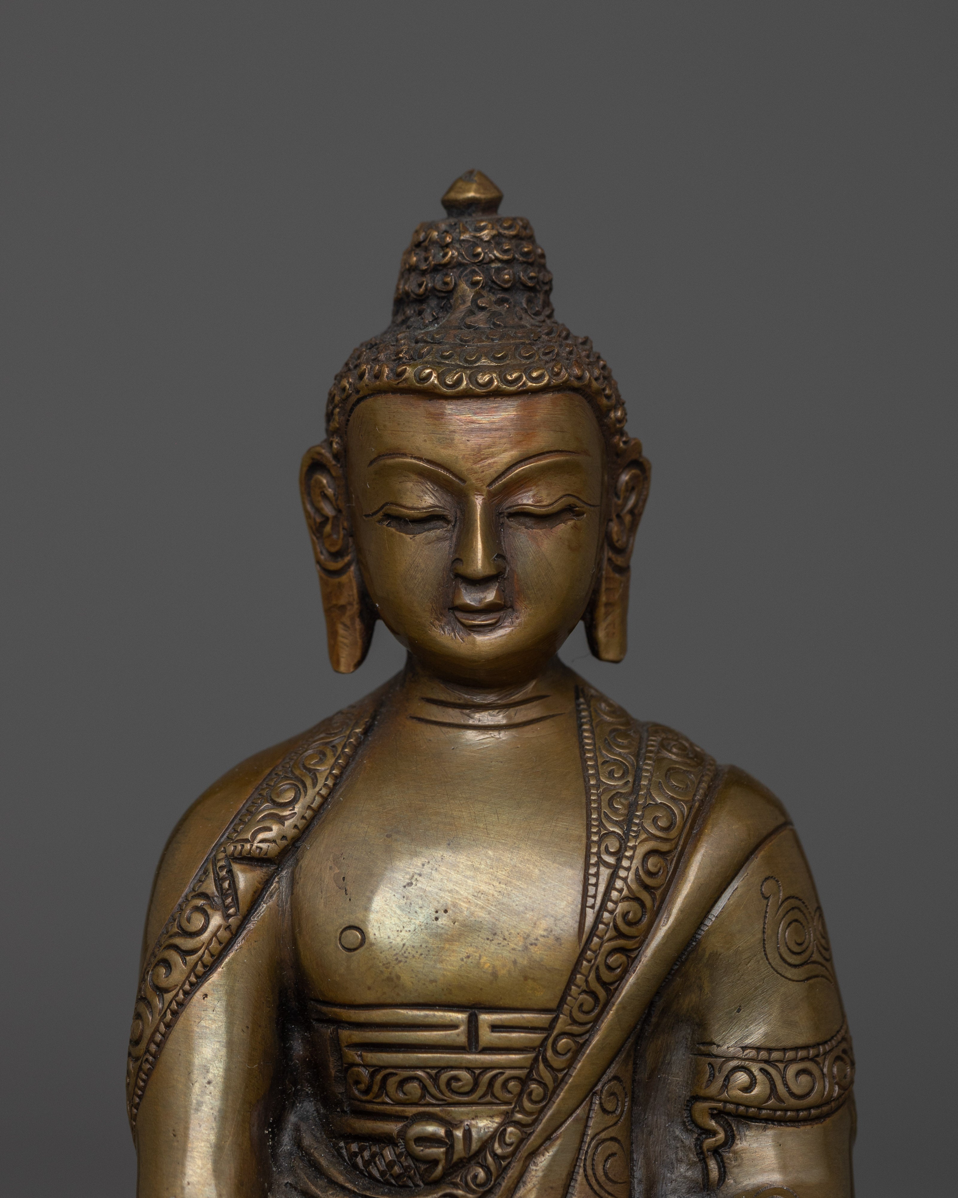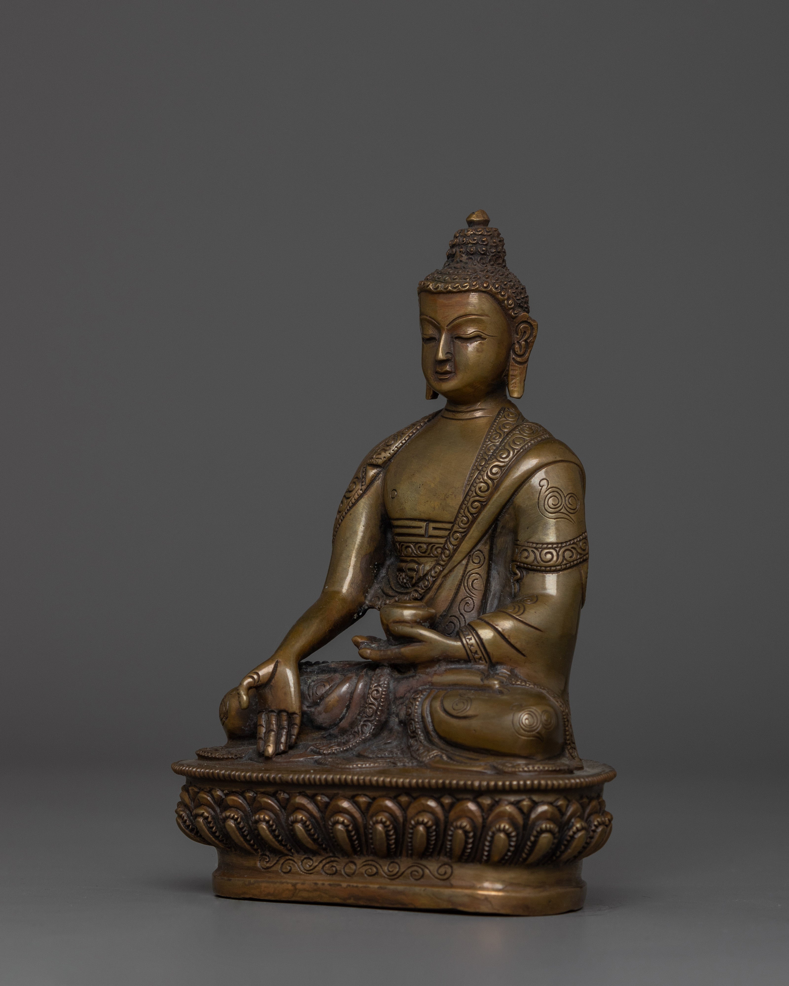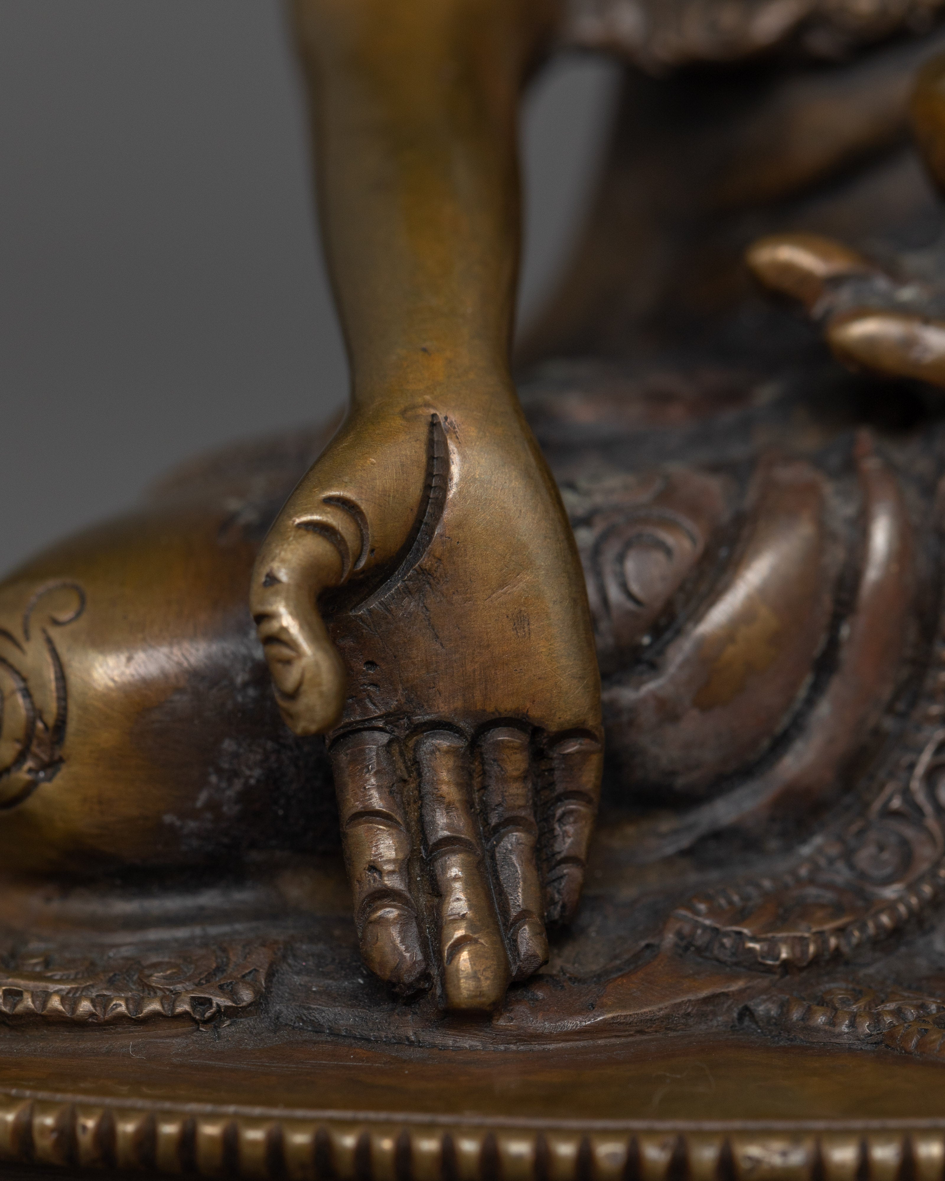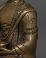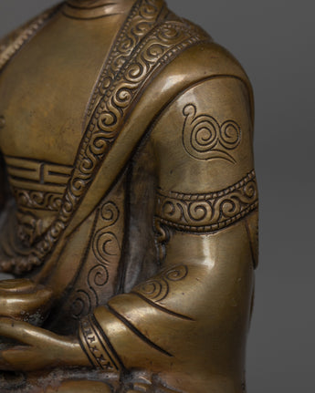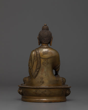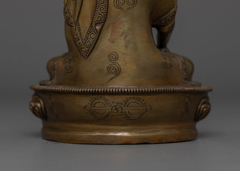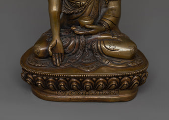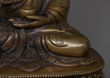 This handmade Buddhist statue features an oxidized copper body. This statue is standing at 5.9”/15cm (Height) and 4.1”/10.5cm (Base). Designed by talented Nepalese artisans, this detailed sculpture is ideal for altars, meditation areas, or as a meaningful decorative item for individuals seeking to cultivate awareness in their daily life.