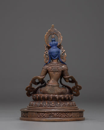 This Handmade Copper Statue of Vajrasattva stands at 7.5”/19 cm in height with a 5.1”/13 cm wide base, weighing 0.80 kg. Expertly crafted from oxidized copper and adorned with detailed acrylic paintings, this piece showcases the skill of its artisans and makes a meaningful addition to personal altars, meditation spaces, or sacred collections.