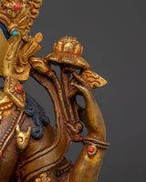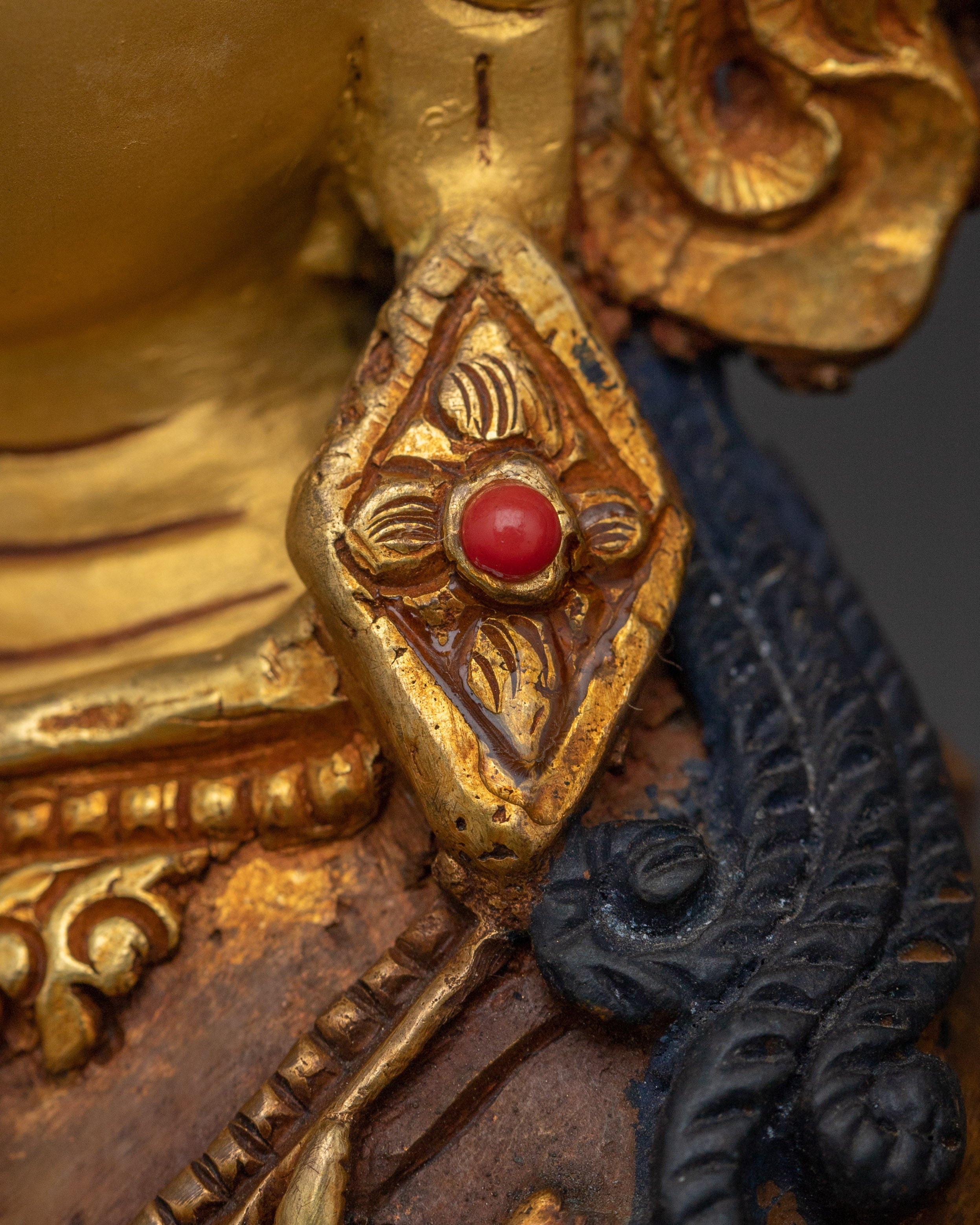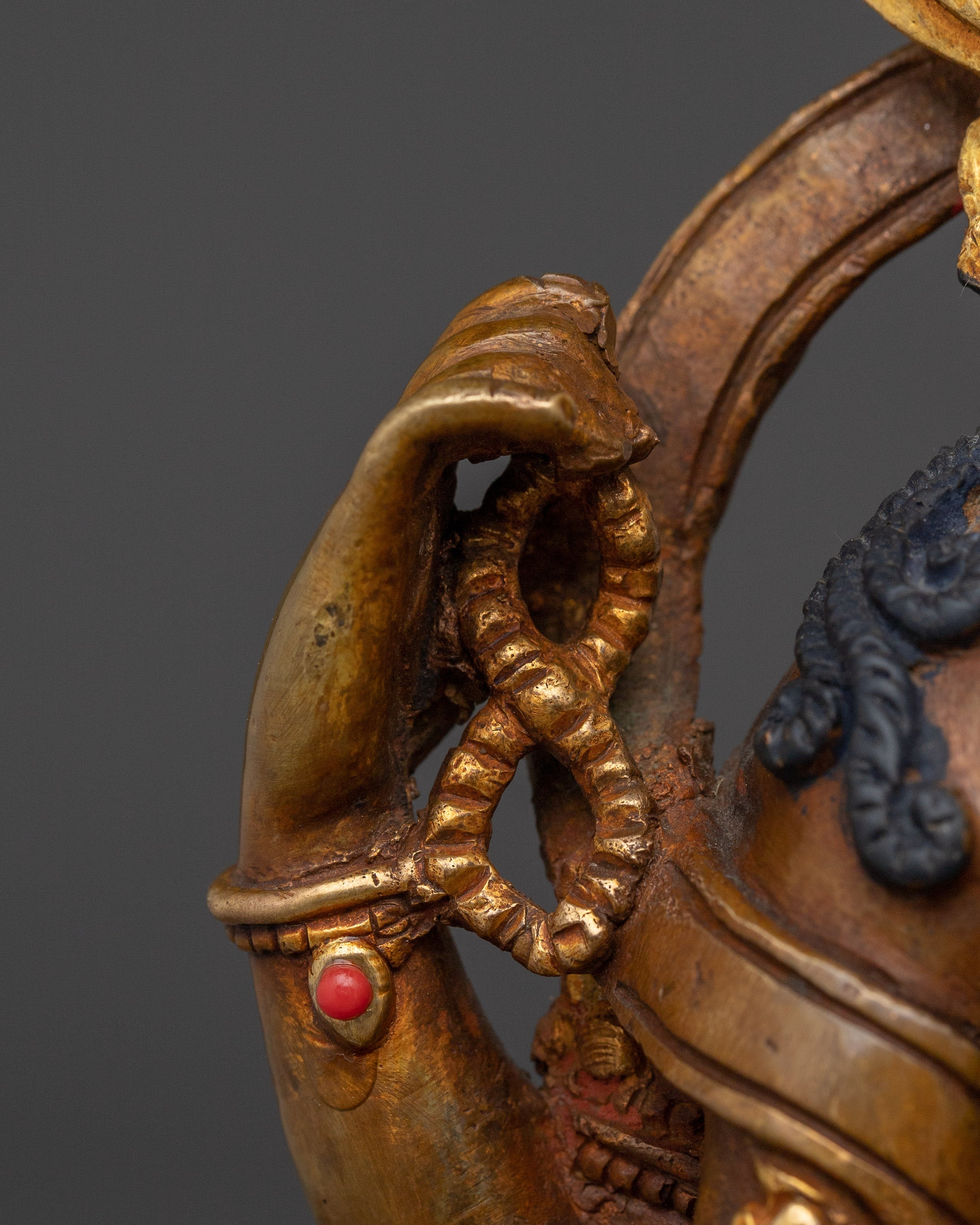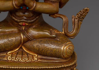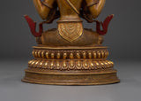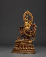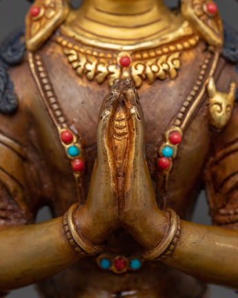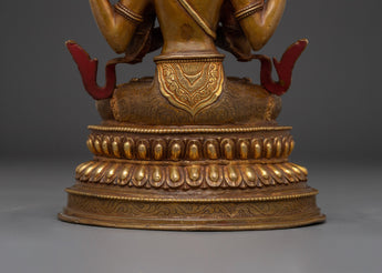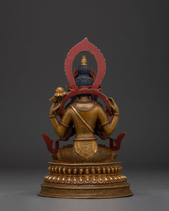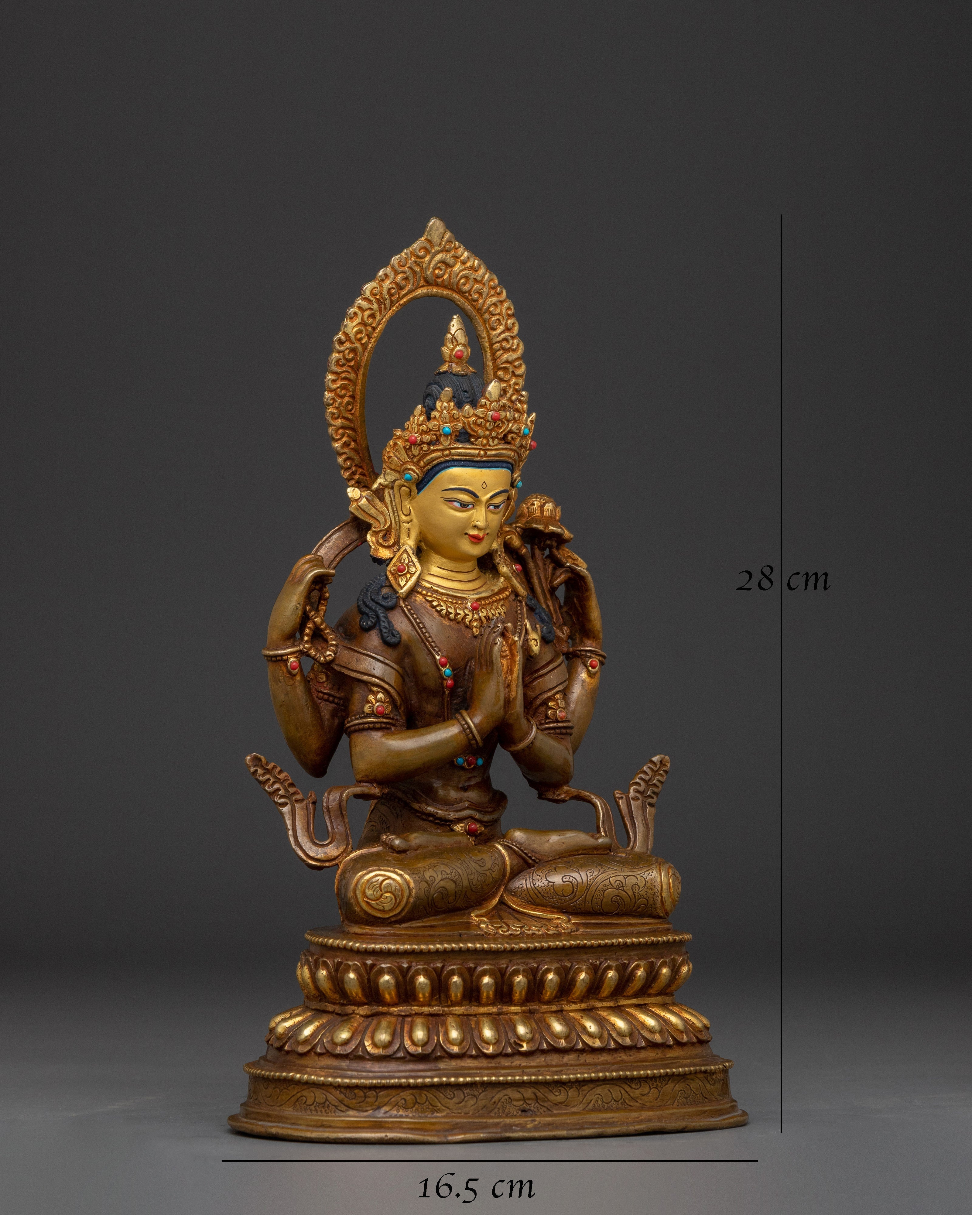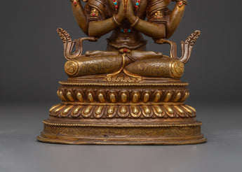 This Golden Lord Chenrezig Artwork, known as the embodiment of boundless compassion, represents boundless love, peace, and the desire to alleviate the suffering of all beings. This handcrafted statue is 11" (Height) x 6.5" (Base) and weighs 2.21 kg. It is made of oxidized copper, adorned with 24K gold gilding, and enhanced with detailed gold and acrylic paints. This sculpture, created by expert Nepalese artisans, symbolizes the spiritual traditions of Himalayan Buddhism and makes a meaningful addition to altars, meditation places, or sacred collections.