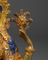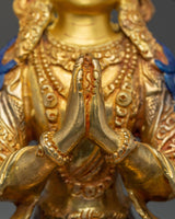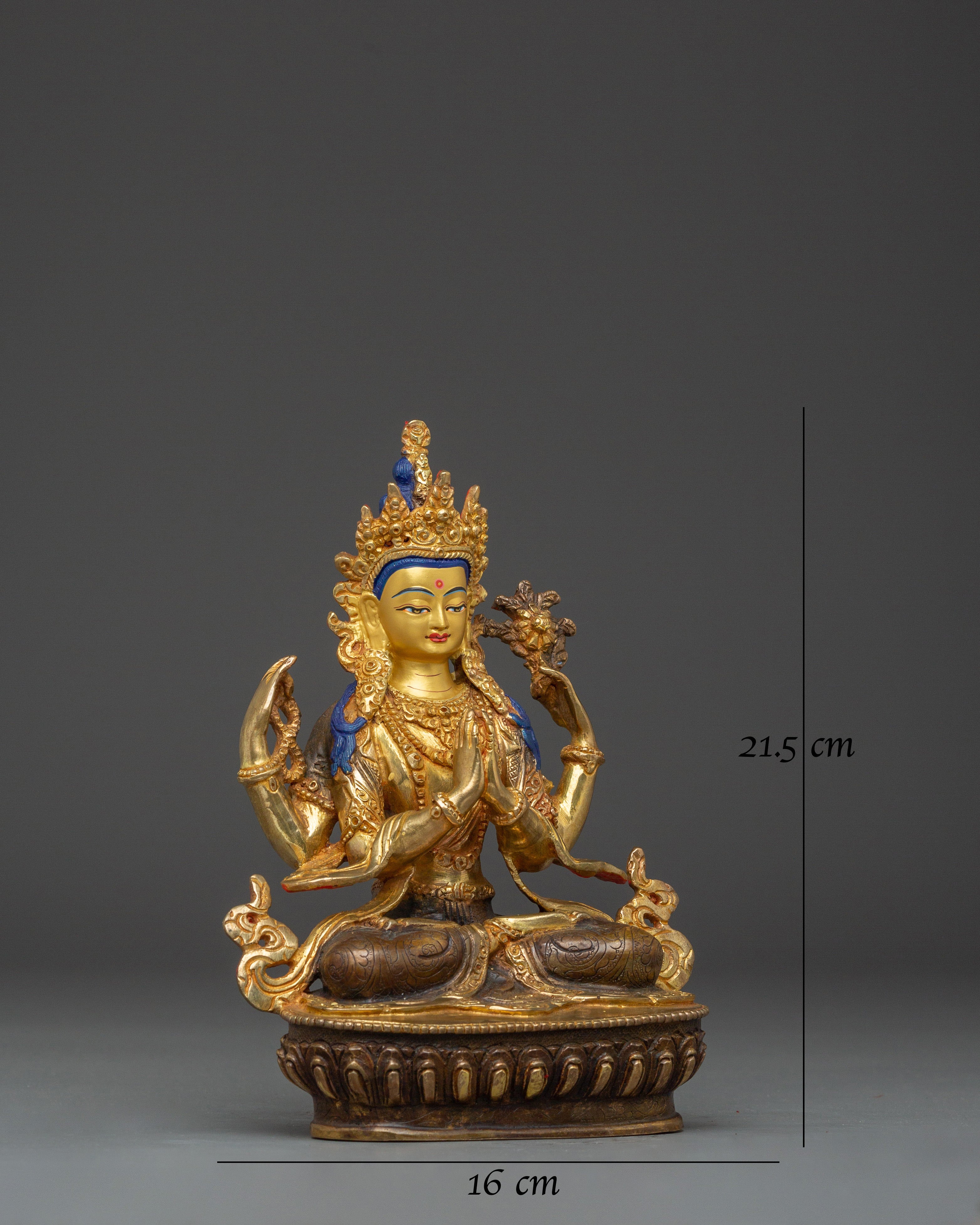 This Lord of Mercy Chenrezig Artwork, known as the embodiment of boundless compassion, represents boundless love, peace, and the desire to alleviate the suffering of all beings. This handcrafted statue is 8.5" (Height) x 6.3" (Base) and weighs 1.47 kg. It is made of copper, adorned with 24K gold gilding, and enhanced with detailed gold and acrylic paints. This sculpture, created by expert Nepalese artisans, symbolizes the spiritual traditions of Himalayan Buddhism and makes a meaningful addition to altars, meditation places, or sacred collections.