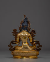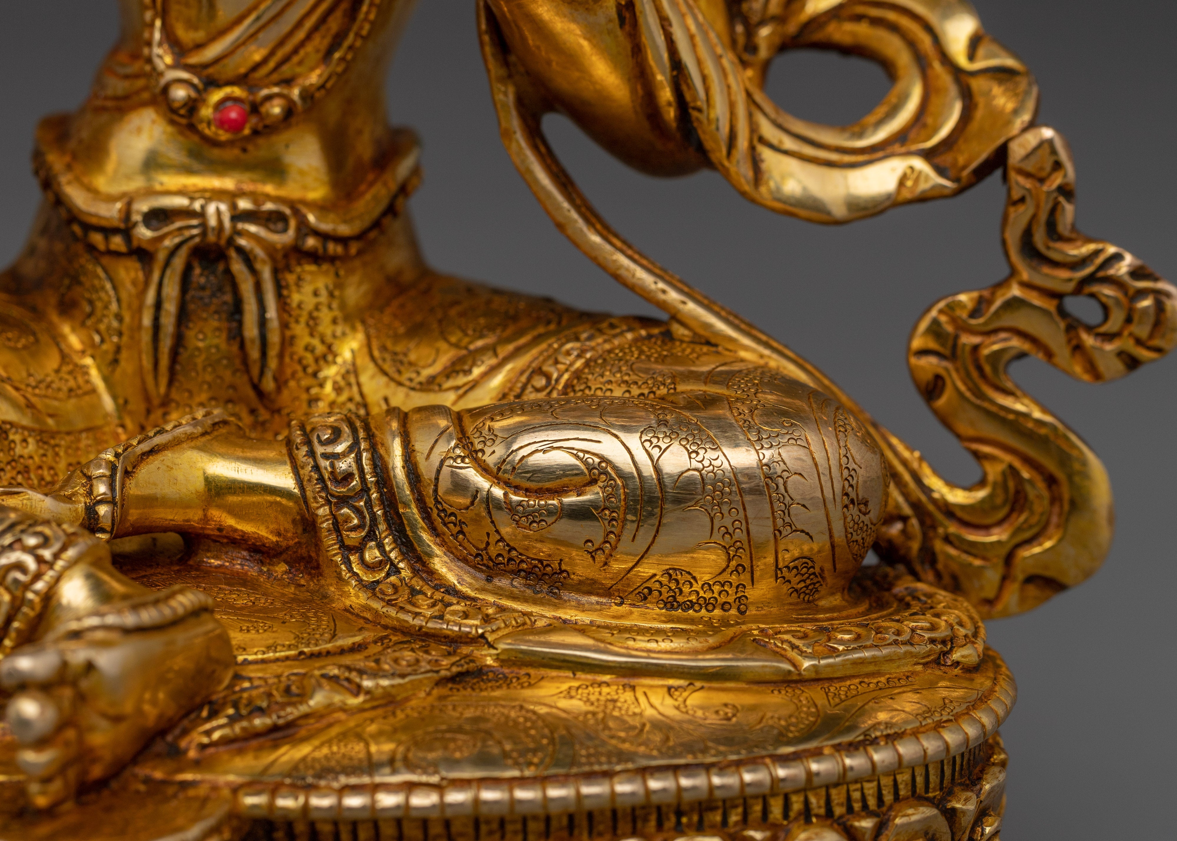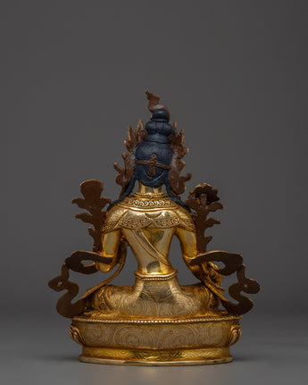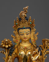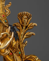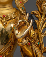 Lotus of Enlightenment Green Tara stands at 8.7 inches (22 cm) in height, with a base measuring 6.7 inches (17 cm), and weighs approximately 1.53 kilograms. Handcrafted from a copper body, it is adorned with 24K gold gilding and enhanced by intricate gold and acrylic paintings that bring her compassionate presence to life. Green Tara is depicted in a posture of readiness and grace, symbolizing her swift response to the suffering of beings. Her peaceful yet dynamic expression is complemented by fine hand-set gemstones, adding elegance and spiritual depth. Revered as the embodiment of active compassion and protector from fears, this statue is a radiant addition to any sacred space or personal altar.