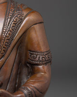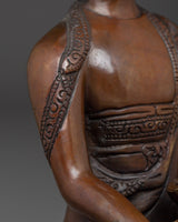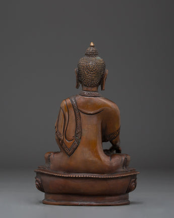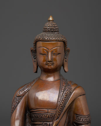 The Shakyamuni Buddha Icon Art symbolizes the Buddha's deep teachings and the path to spiritual awakening. This handcrafted statue is 7.9" (Height) x 5.5" (Base) and weighs 1.04 kg. It is made of oxidized copper. This sacred statue, created by expert Nepalese artisans, represents the craftsmanship of Himalayan Buddhism, making it an inspirational addition to altars, meditation places, or sacred collections.
