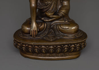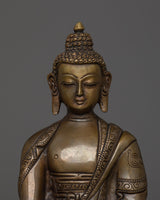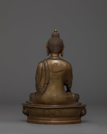 This statue of Shakyamuni Buddha measures 5.9 inches (15 cm) in height and 4.1 inches (10.5 cm) at the base, with a weight of 0.64 kilograms. It is crafted from an oxidized copper body. Designed by talented Nepalese artisans, this detailed sculpture is ideal for altars, meditation areas, or as a meaningful decorative item for individuals seeking to cultivate awareness in their daily life.