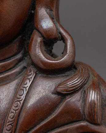 The Singing Yogi Milarepa Sculpture stands 3.9” (10 cm) tall, with a base width of 3.7” (9.5 cm), and weighs 0.65 kg. Crafted from oxidized copper, it captures the serene and humble essence of Milarepa, the renowned Tibetan yogi and meditation master. Known for his deep spiritual practice and teachings, this statue is a meaningful piece for meditation spaces, personal altars, or as a symbol of dedication and enlightenment.