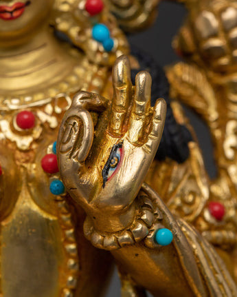 The seven eyes represent Sita Tara’s all-seeing awareness, allowing her to perceive suffering everywhere and respond with compassion. The vitarka mudrā in her right hand symbolizes teaching and discussion, showing her role in guiding beings with wisdom. The lotus growing from her fingers represents purity and spiritual awakening, rising unstained from the mud. The varada mudrā in her left hand signifies generosity and granting blessings, showing her kindness and readiness to help. Her gemstone-adorned crown radiates peaceful energy, reflecting her serene and compassionate nature. Together, these features highlight her power to bring calm, wisdom, and protection.
