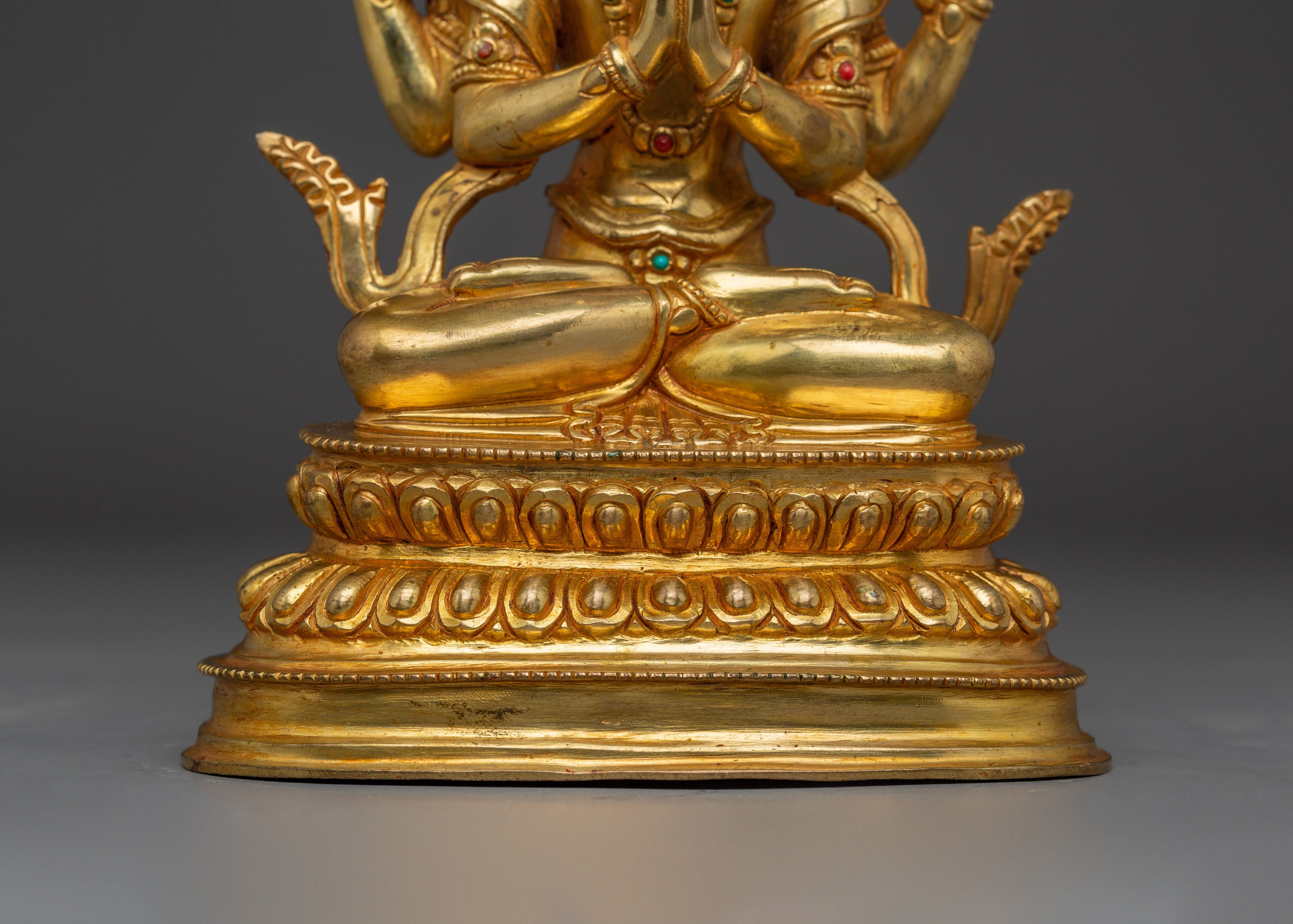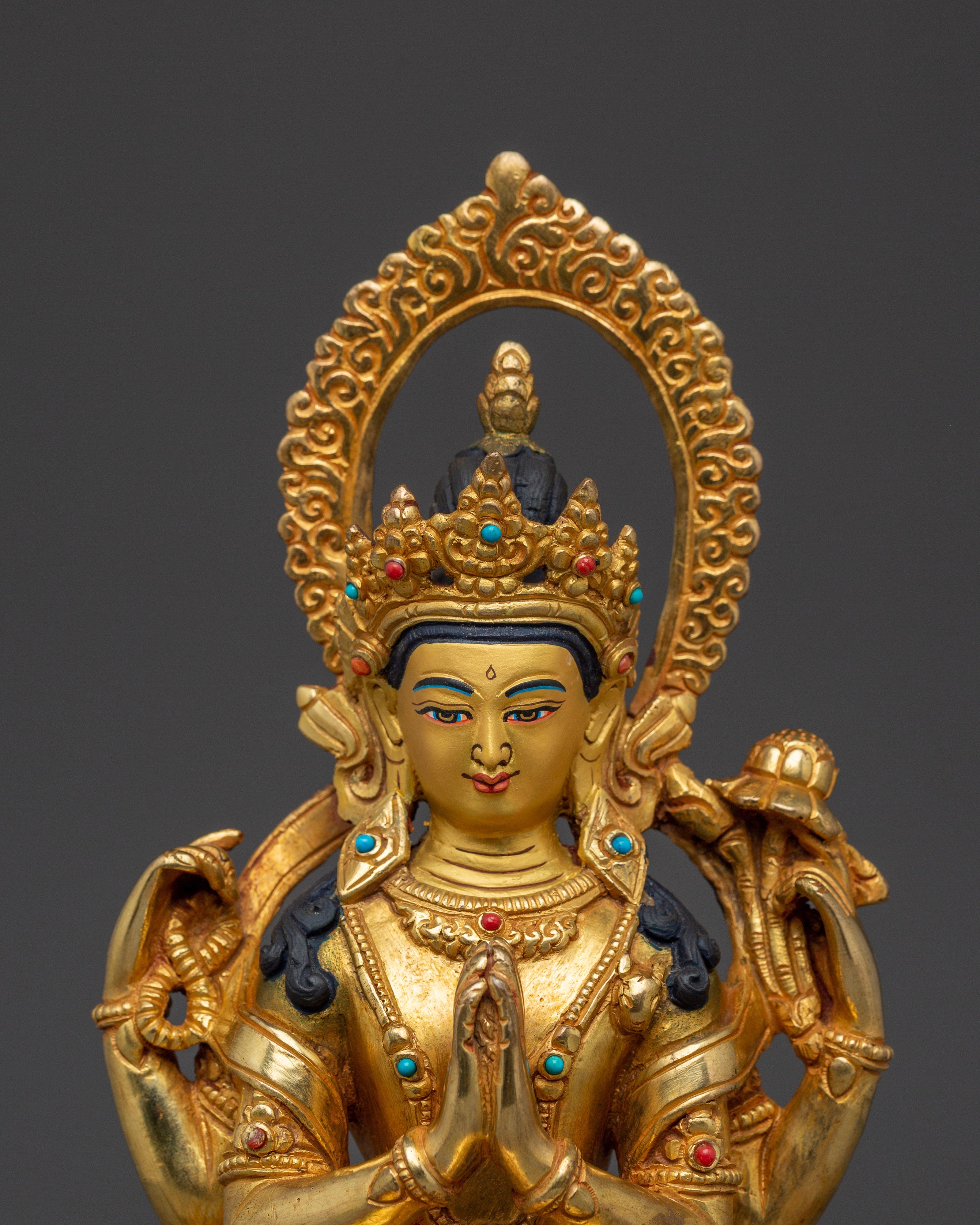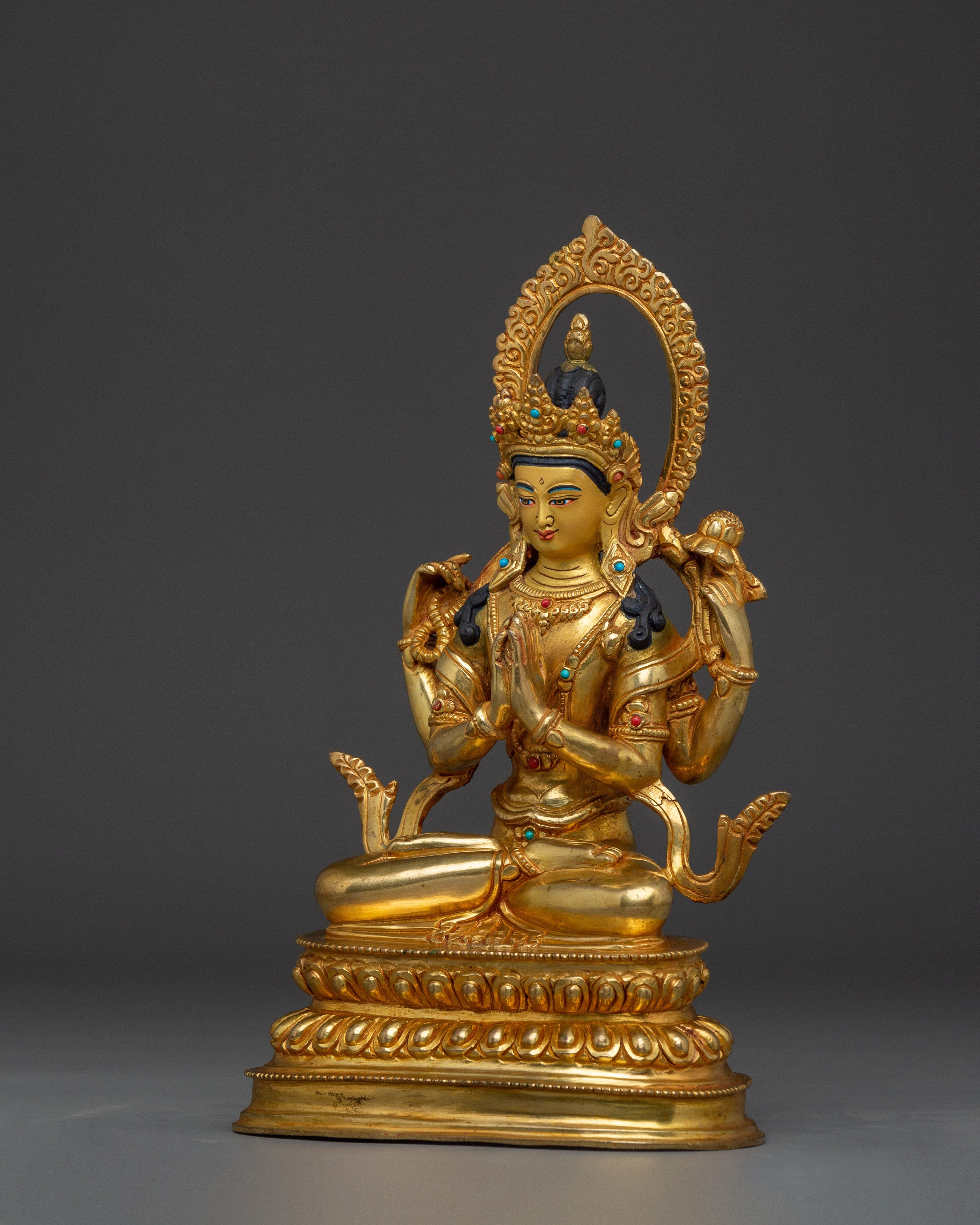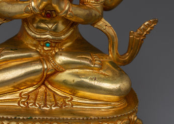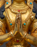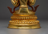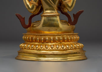 This Spiritual Chenrezig Artwork, known as the embodiment of boundless compassion, represents boundless love, peace, and the desire to alleviate the suffering of all beings. This handcrafted statue is 10.6" (Height) x 6.3" (Base) and weighs 1.95 kg. It is made of copper, adorned with 24K gold gilding, and enhanced with detailed gold and acrylic paints. This sculpture, created by expert Nepalese artisans, symbolizes the spiritual traditions of Himalayan Buddhism and makes a meaningful addition to altars, meditation places, or sacred collections.