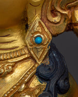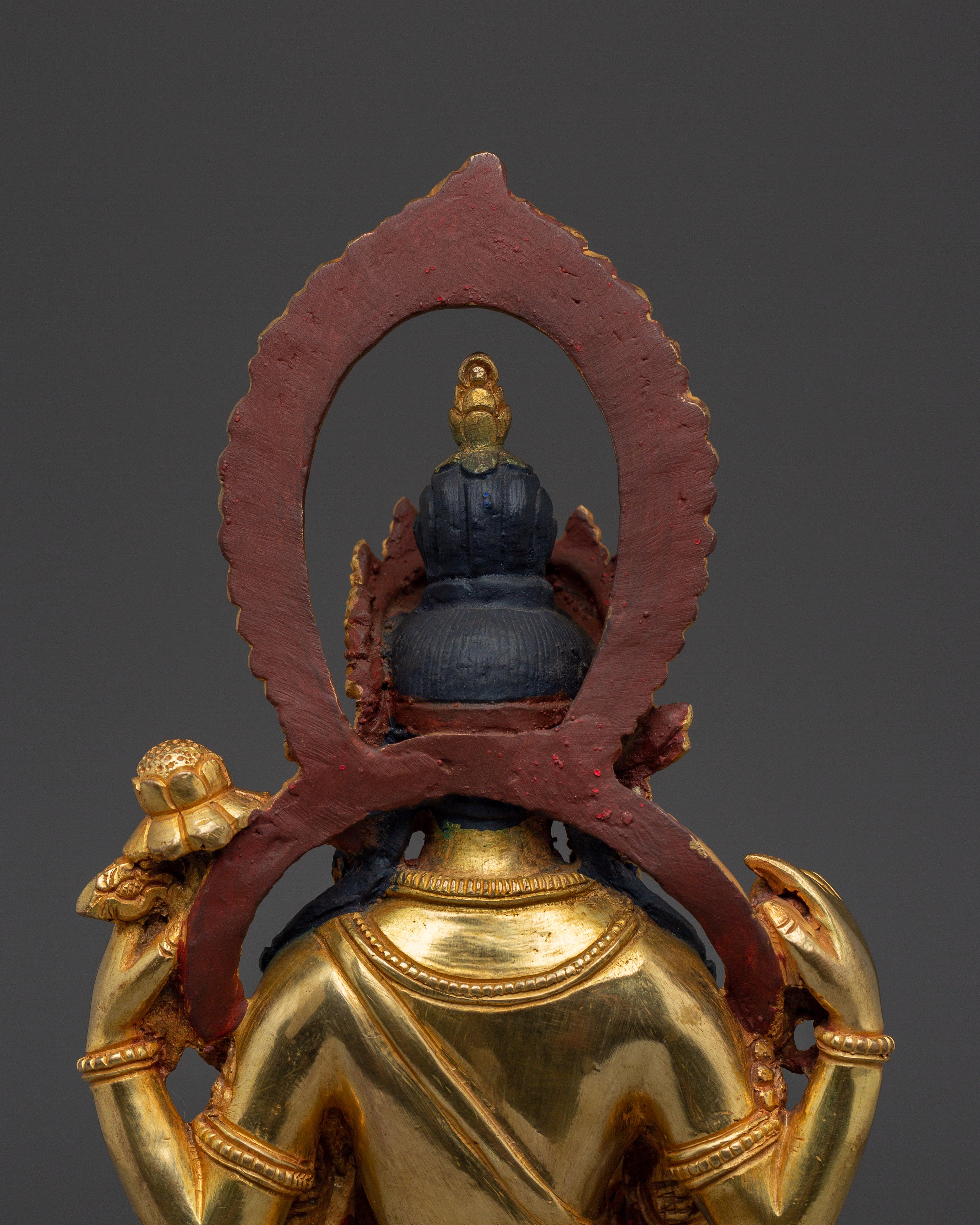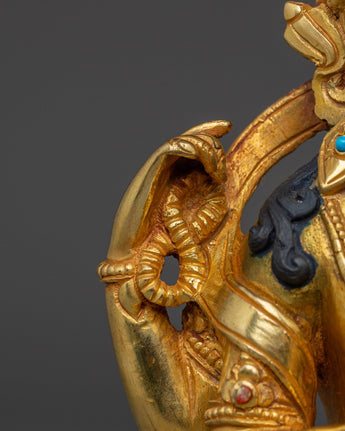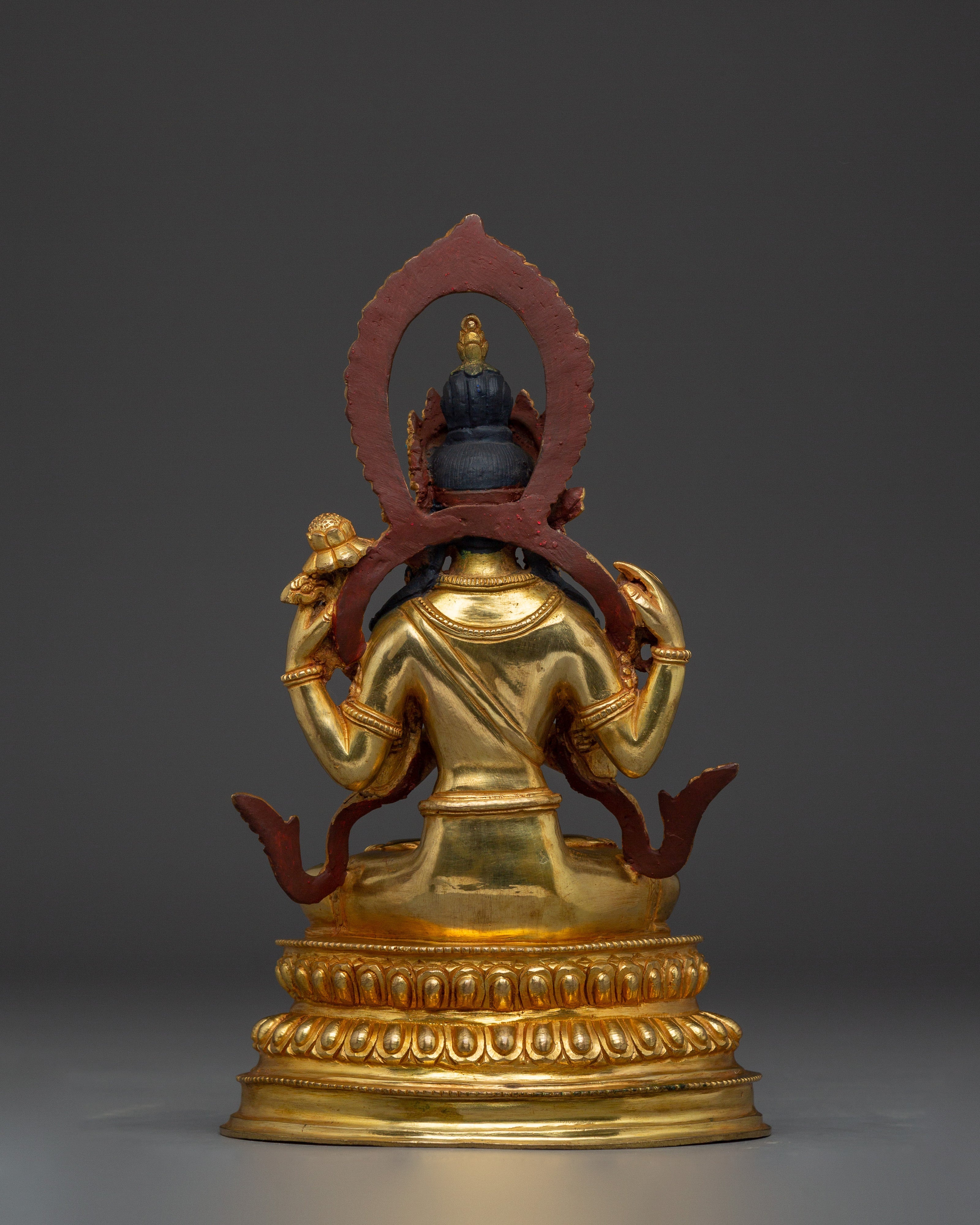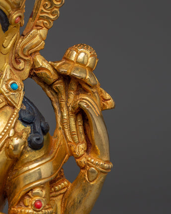 This Spiritual Chenrezig Artwork, known as the embodiment of boundless compassion, represents boundless love, peace, and the desire to alleviate the suffering of all beings. This handcrafted statue is 10.6" (Height) x 6.3" (Base) and weighs 1.95 kg. It is made of copper, adorned with 24K gold gilding, and enhanced with detailed gold and acrylic paints. This sculpture, created by expert Nepalese artisans, symbolizes the spiritual traditions of Himalayan Buddhism and makes a meaningful addition to altars, meditation places, or sacred collections.