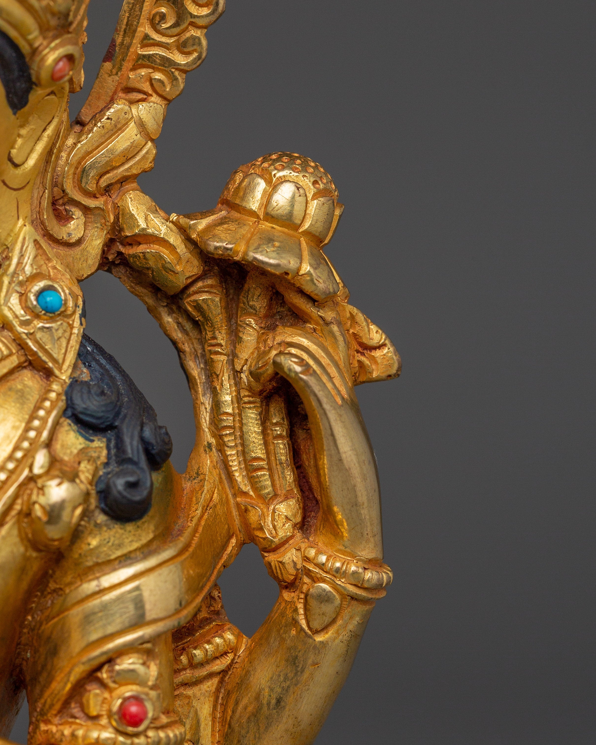 The deity sits on a moon-disc lotus seat. A crystal rosary in the upper right-hand symbolizes the never-ending cycle of life, death, and regeneration. The lotus in the upper left-hand represents the deity's role in assisting mankind to overcome adversity and unpleasant conditions, including hellish realms. The lower hands are gently put in a namaste motion, grasping a wish-fulfilling Jewel. The deity's gentle and calm expression symbolizes compassion and calmness.