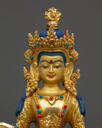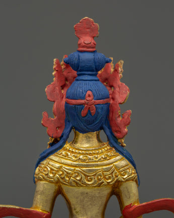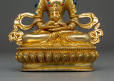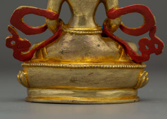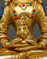 This 5.9 Inch Statue of Amitayus: Longevity Buddha stands at 15 cm (5.9 inches) in height with an 11.5 cm (4.5 inches) broad base, weighing 0.54 kg. Crafted from copper and adorned with 24K gold gilding, gold and acrylic paintings, and inlaid gemstones, this statue reflects meticulous artistry. Representing Amitayus, the Buddha of Longevity, the statue symbolizes long life, merit, and spiritual abundance, making it a meaningful addition to altars, meditation spaces, or personal sacred collections.