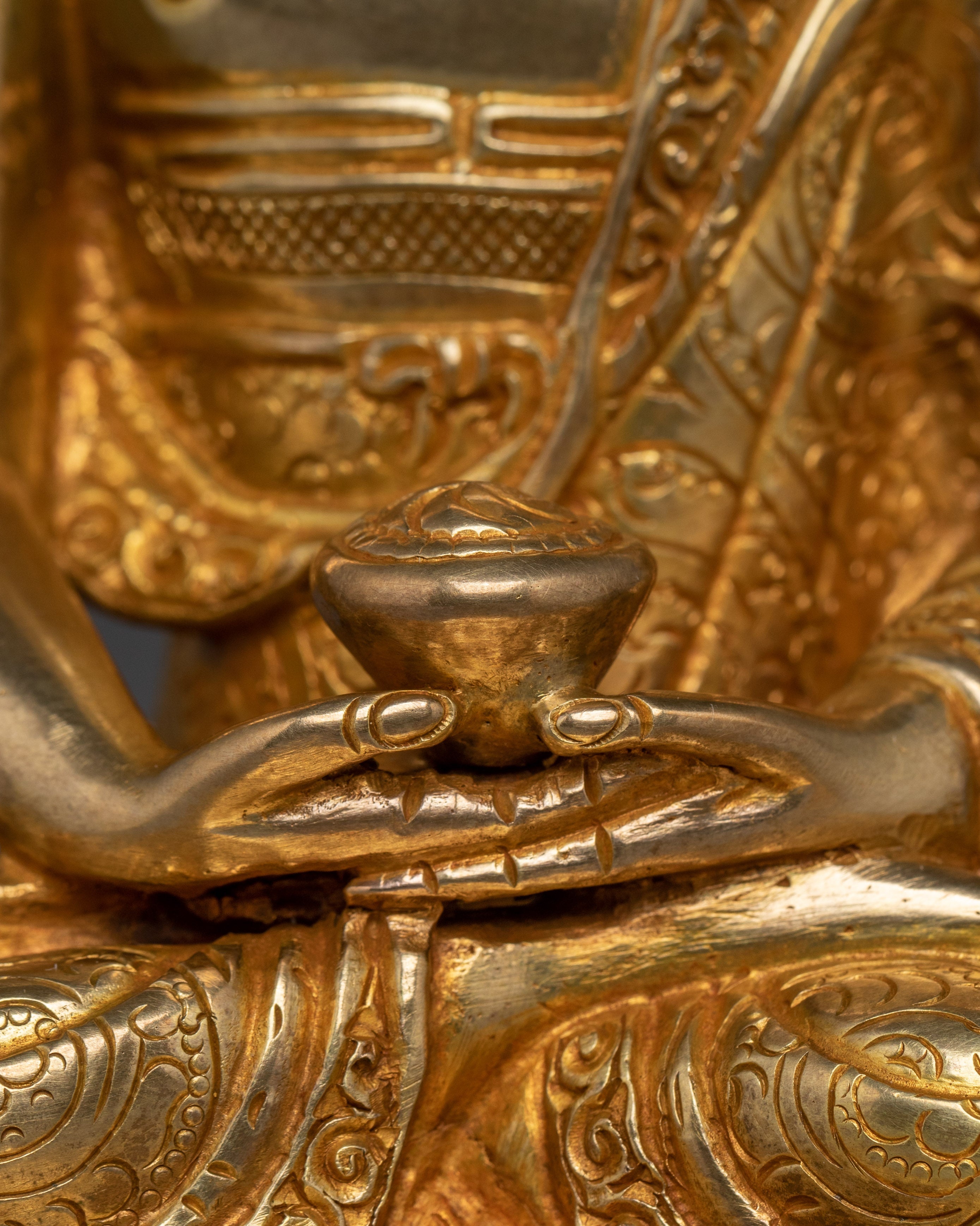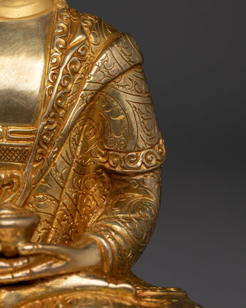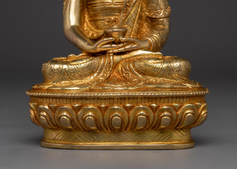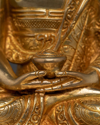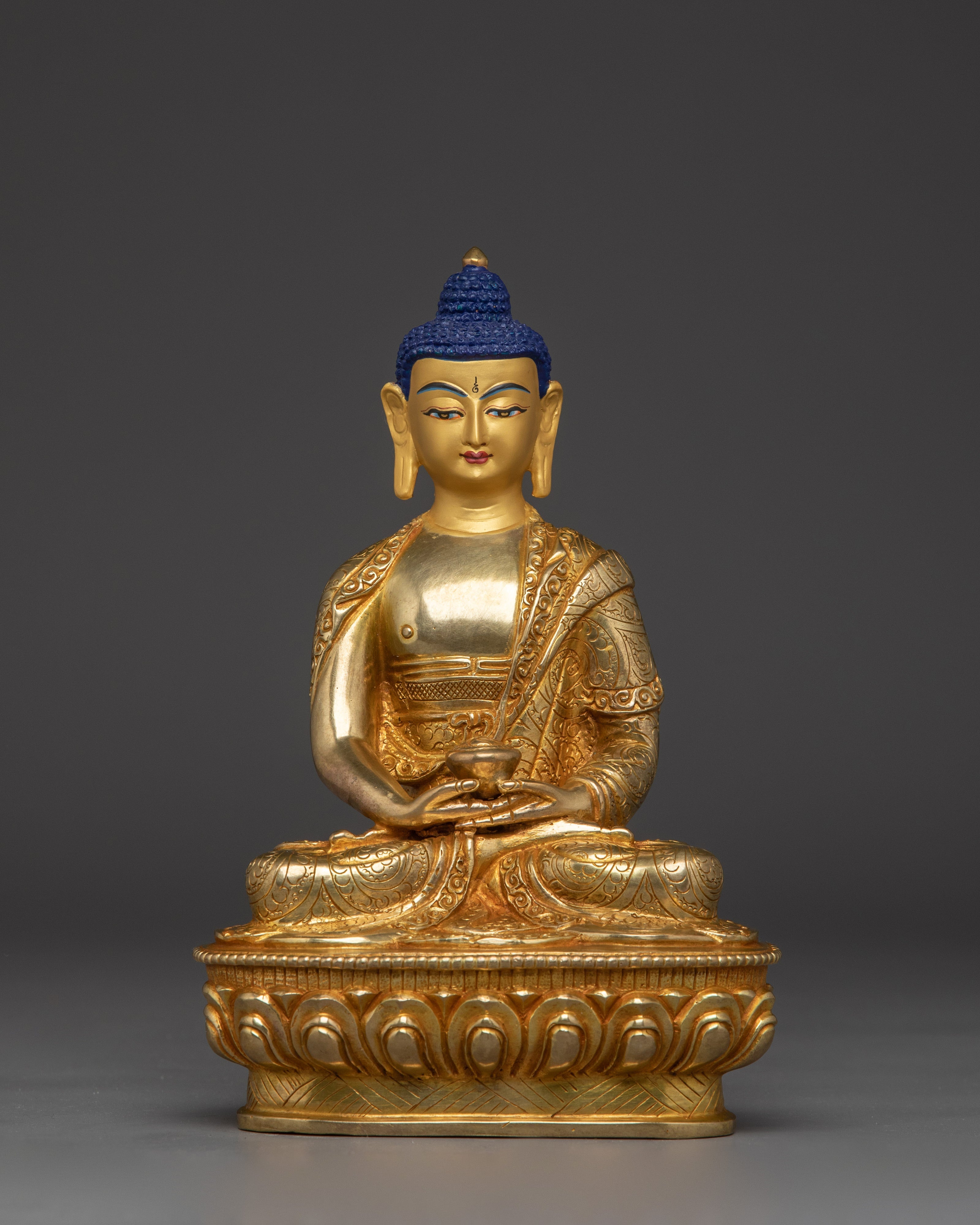 Amitabha is shown in a tranquil sitting stance, holding an alms bowl in his lap to symbolize renunciation and the simplicity of the enlightened life. His peaceful countenance represents the knowledge and compassion he bestows on individuals seeking rebirth in his Pure Land, Amitabha's dedication to assisting all creatures in achieving spiritual awareness and freedom is demonstrated by this gesture.