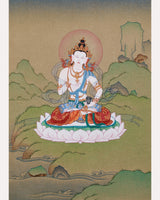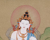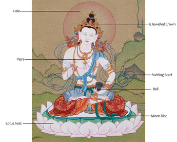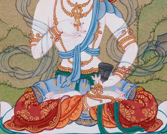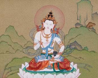 Vajrasattva, a revered figure in Tibetan Buddhism, embodies purification and is called upon to eliminate obstacles and negative karma. Practitioners often chant the mantra "Om Vajrasattva Hum" to purify their hearts and minds, thereby overcoming emotional and mental barriers. This exquisite thangka depicts Vajrasattva seated on a lotus throne, symbolizing spiritual awakening and purity. The surrounding sacred qualities highlight his role in purification, while his serene expression radiates calm. He is adorned with a five-jeweled crown, a bell, a swirling scarf, and a vajra, each symbolizing different facets of his strength and wisdom. The thangka also features a moon disc beneath him, enhancing the sense of peace and purity. Order your Vajrasattva Thangka today to harness the power of purification and invite his transformative energy into your space.