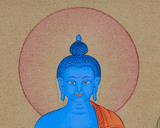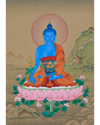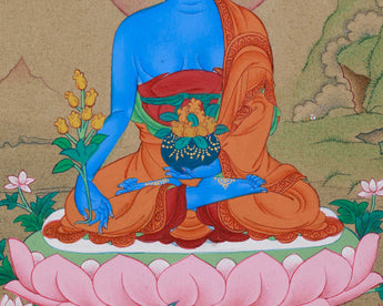 In this thangka, Bhaisajyaguru is depicted seated in a meditative posture atop a multi-petaled lotus throne. He is holding a bowl of healing nectar in his left hand and a myrobalan plant in his right, both symbols of longevity and healing. His body, rendered in deep lapis lazuli blue, emanates a serene energy and mirrors the expansive nature of his compassion. Crafted with meticulous precision and symbolic significance, this Bhaisajyaguru Thangka functions as a potent spiritual instrument for meditation, visualization, and the invocation of healing energies. Whether utilized on an altar, within a shrine, or as an esteemed art piece, it embodies a profound intent of healing, clarity, and liberation from suffering.