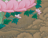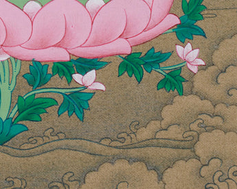 This Tibetan Buddha, Bhaisajyaguru, also known as the Medicine Buddha, embodies healing power. Created on cotton canvas using natural stone colors and genuine 24K gold accents, it exemplifies the traditional Karma Gadri style, celebrated for its flowing landscapes and subtle elegance. The Thangka's detailed brushwork and mineral pigments make it not only a beautiful artwork but also a spiritual tool that fosters inner harmony, healing, and mindfulness.