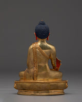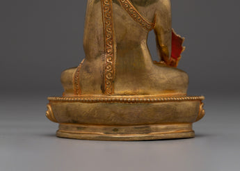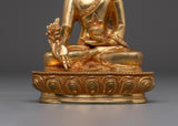Tibetan Medicine Buddha Figurine stands 5.3” (13.5 cm) tall with a base width of 4.1” (10.5 cm) and weighs 0.57 kg. It is made from a copper body and beautifully finished with 24K gold gilding, along with detailed gold and acrylic paintings. Despite its small size, the statue carries deep spiritual meaning and fine craftsmanship, making it a perfect addition to a personal altar, meditation space, or as a meaningful gift.