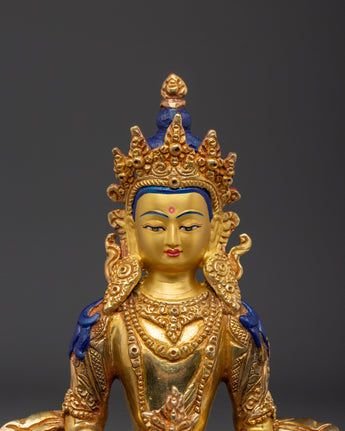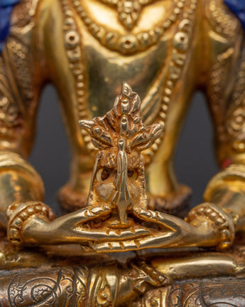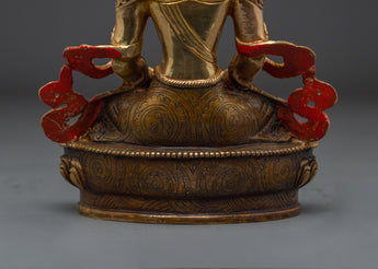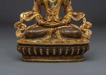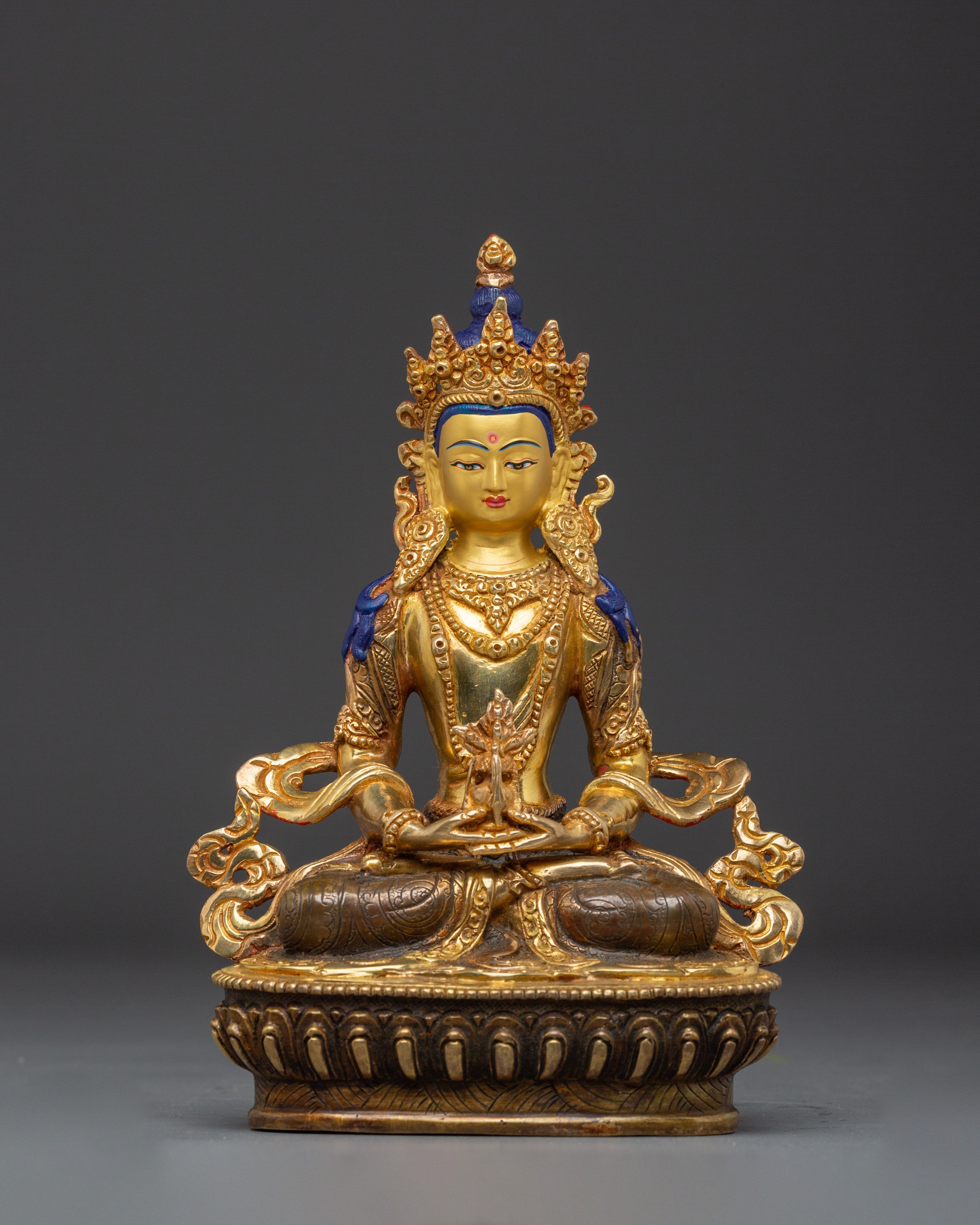 Amitayus is represented sitting in a meditative posture, indicating his vast wisdom and unwavering concentration. His hands are in dhyana mudra, holding a kalasha, a holy vase filled with the nectar of immortality, representing his function as the giver of long life and energy. His calm demeanor radiates compassion and inner peace, Inspiring practitioners to practice mindfulness and tranquility.