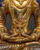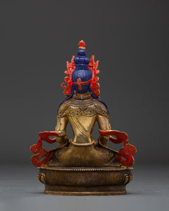 This Tibetan Art of Amitayus is known as the deity of longevity, representing eternal life, knowledge, and spiritual blessings. This statue measures 8.7" (Height) x 5.7" (Base) and weighs 1.38 kg. It is made from fine copper, gilded with 24K gold, acrylic paintings, and deeply engraved with hand-carved gemstones. This artwork is created by expert Nepalese craftsmen representing the holy creativity of Himalayan Buddhism and would make an ideal addition to altars, meditation rooms, or sacred collections.