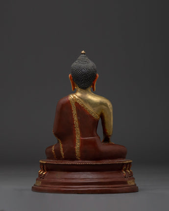 Shakyamuni Buddha is depicted sitting in the lotus pose (padmasana), indicating his steady concentration and mastery over the distractions of the material world. His right hand stretched toward the earth in bhumisparsha mudra, representing his moment of enlightenment, inviting the earth to witness his waking. The left hand, lying gently in his lap in dhyana mudra, holding an alms bowl, depicts the profound state of meditation and mindfulness that leads to insight and clarity.