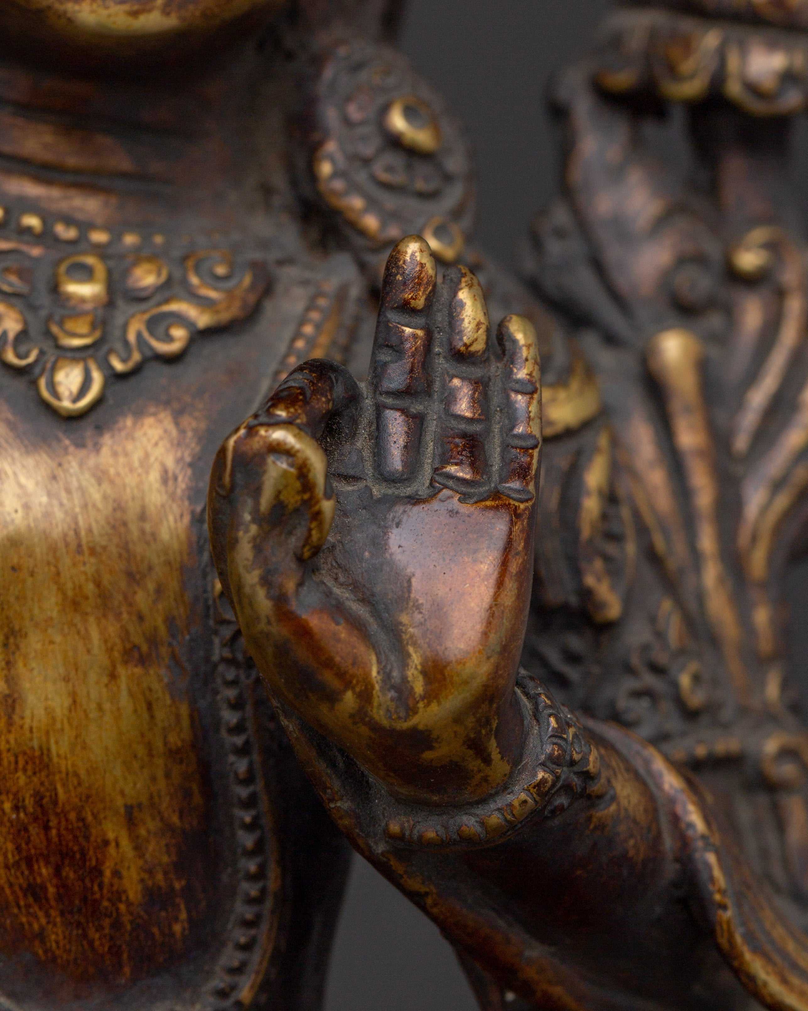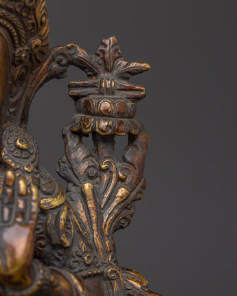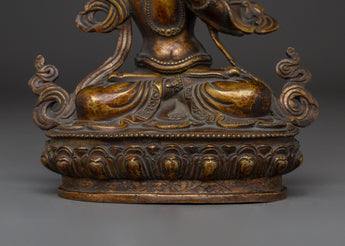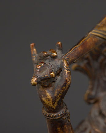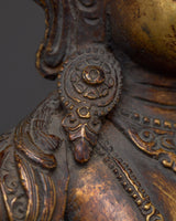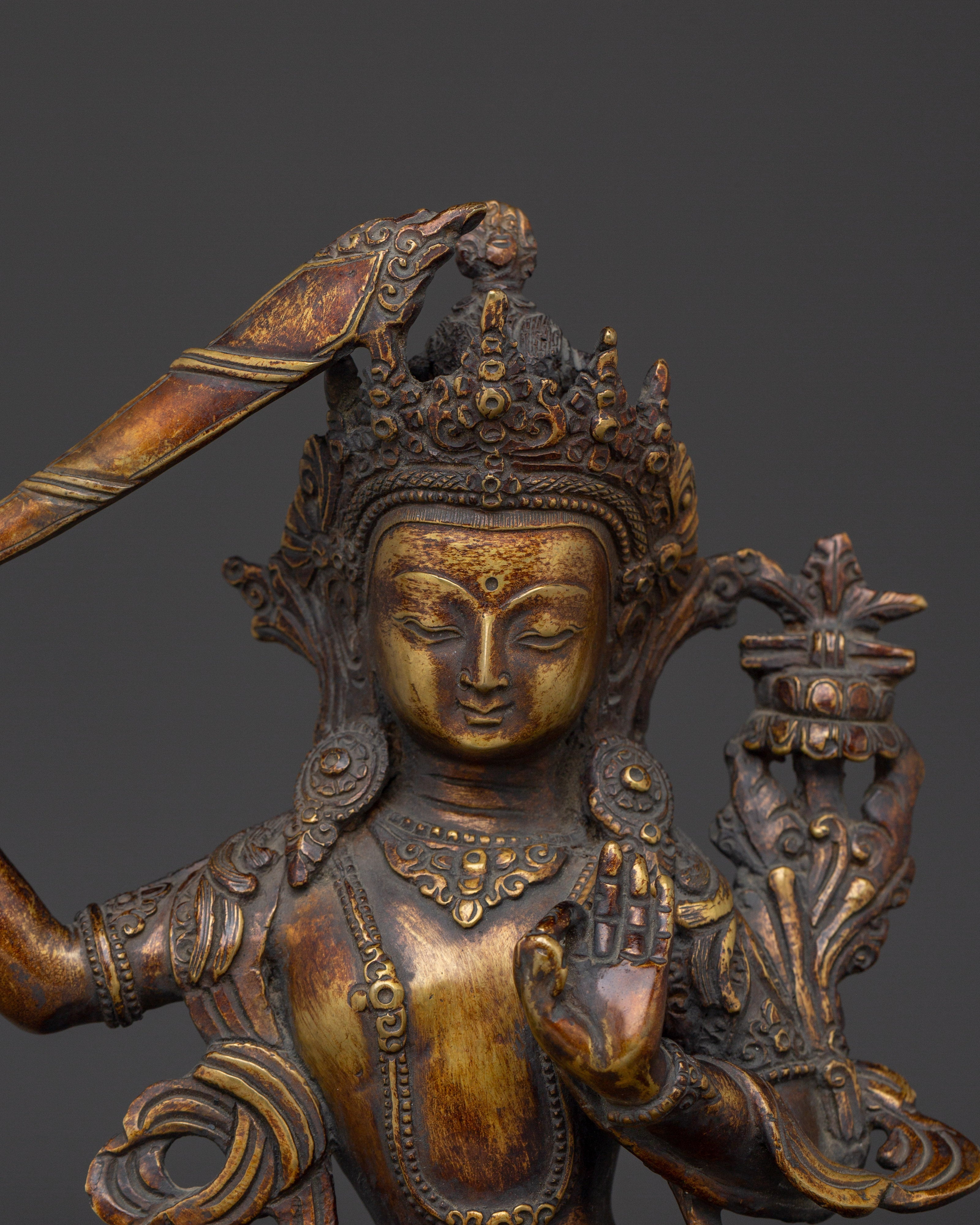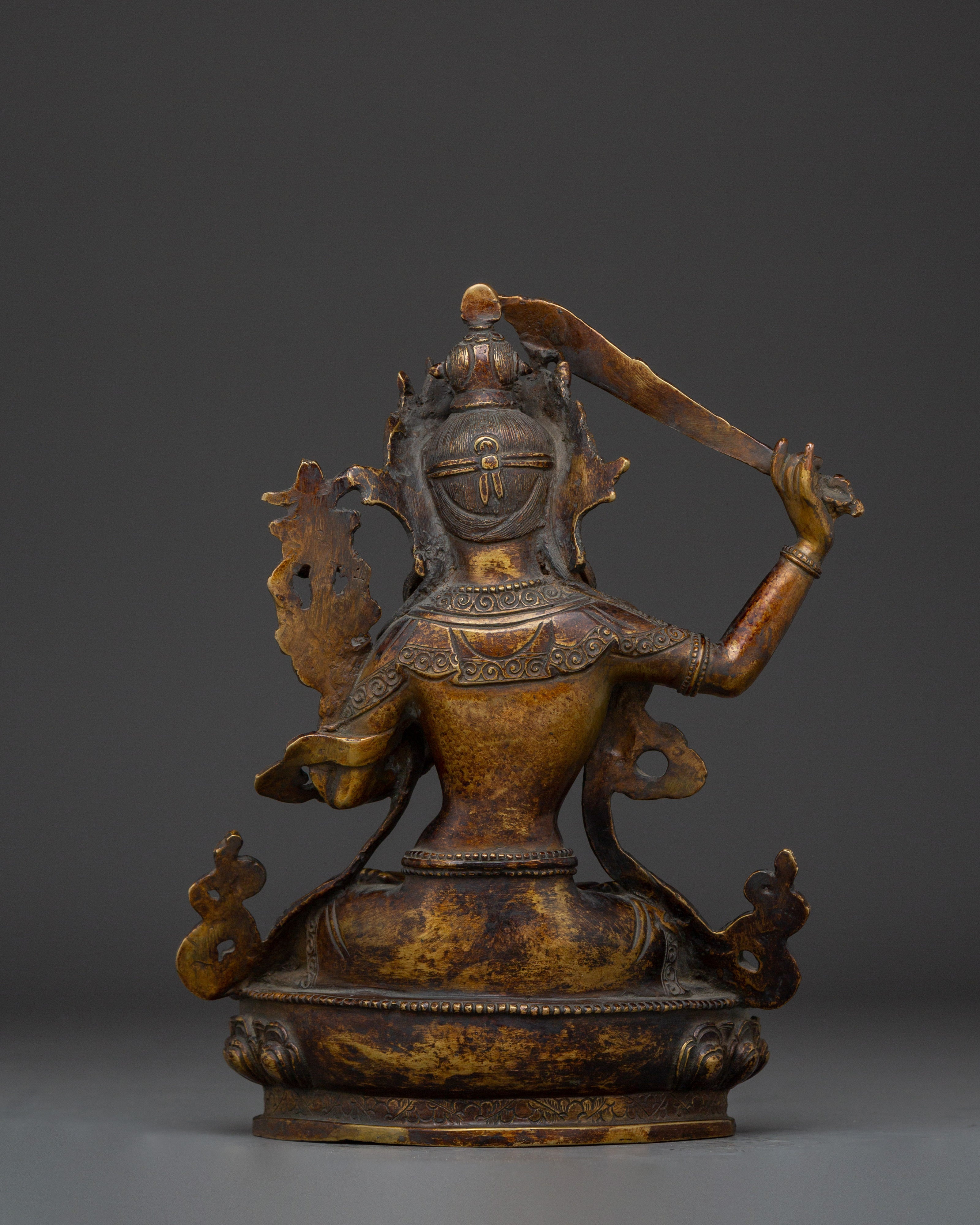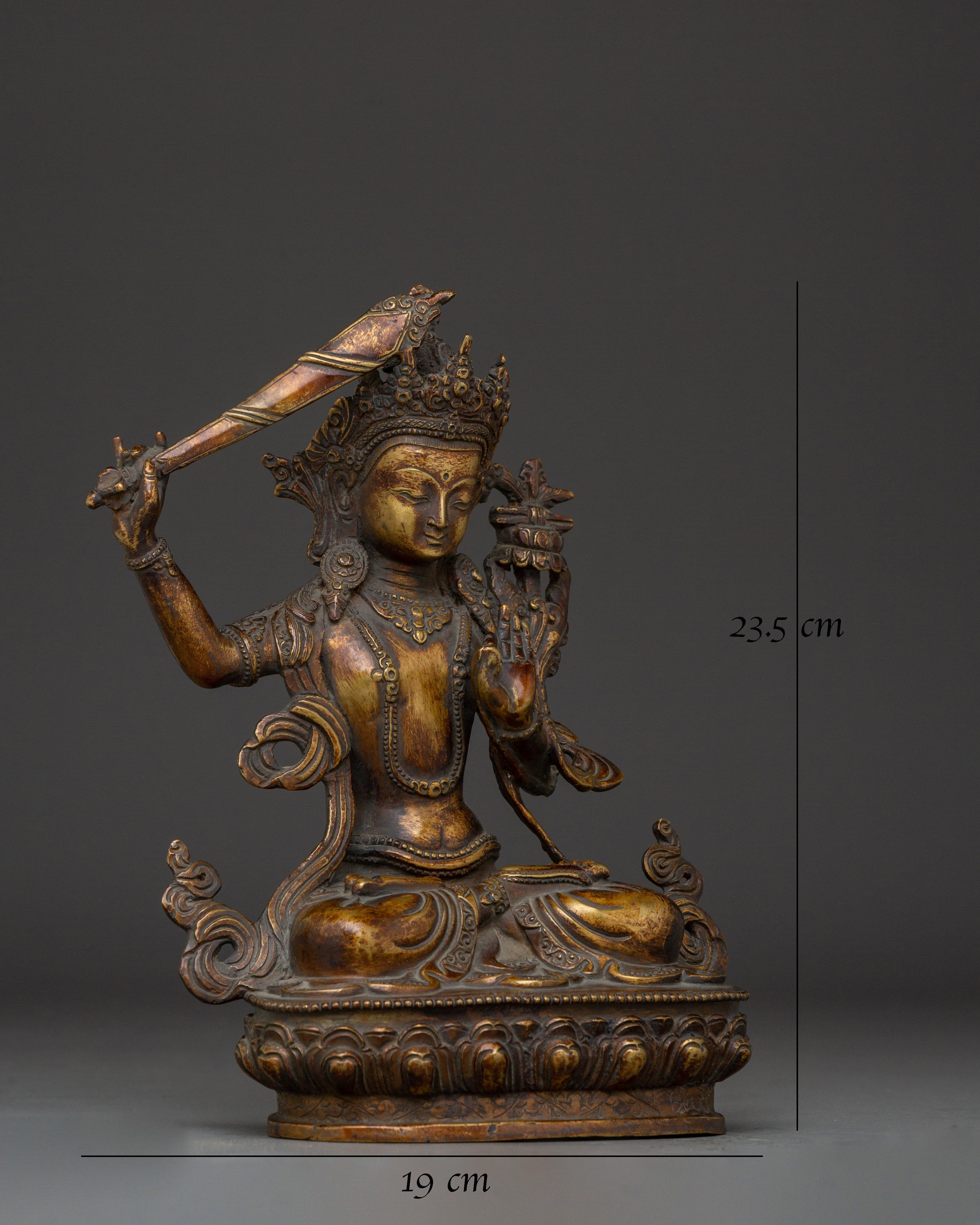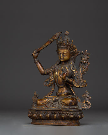 The Ultimate Wisdom Bodhisattva Manjushri Statue measures 9.3 inches (23.5cm) in height and 7.5 inches (19cm) at the base. The Bodhisattva of Wisdom is crafted from an oxidized copper body adorned with 24K gold gilding. Crafted by expert artisans, this item symbolizes the rich traditions of Himalayan Buddhism, making it an important addition to altars, meditation places, or holy collections.