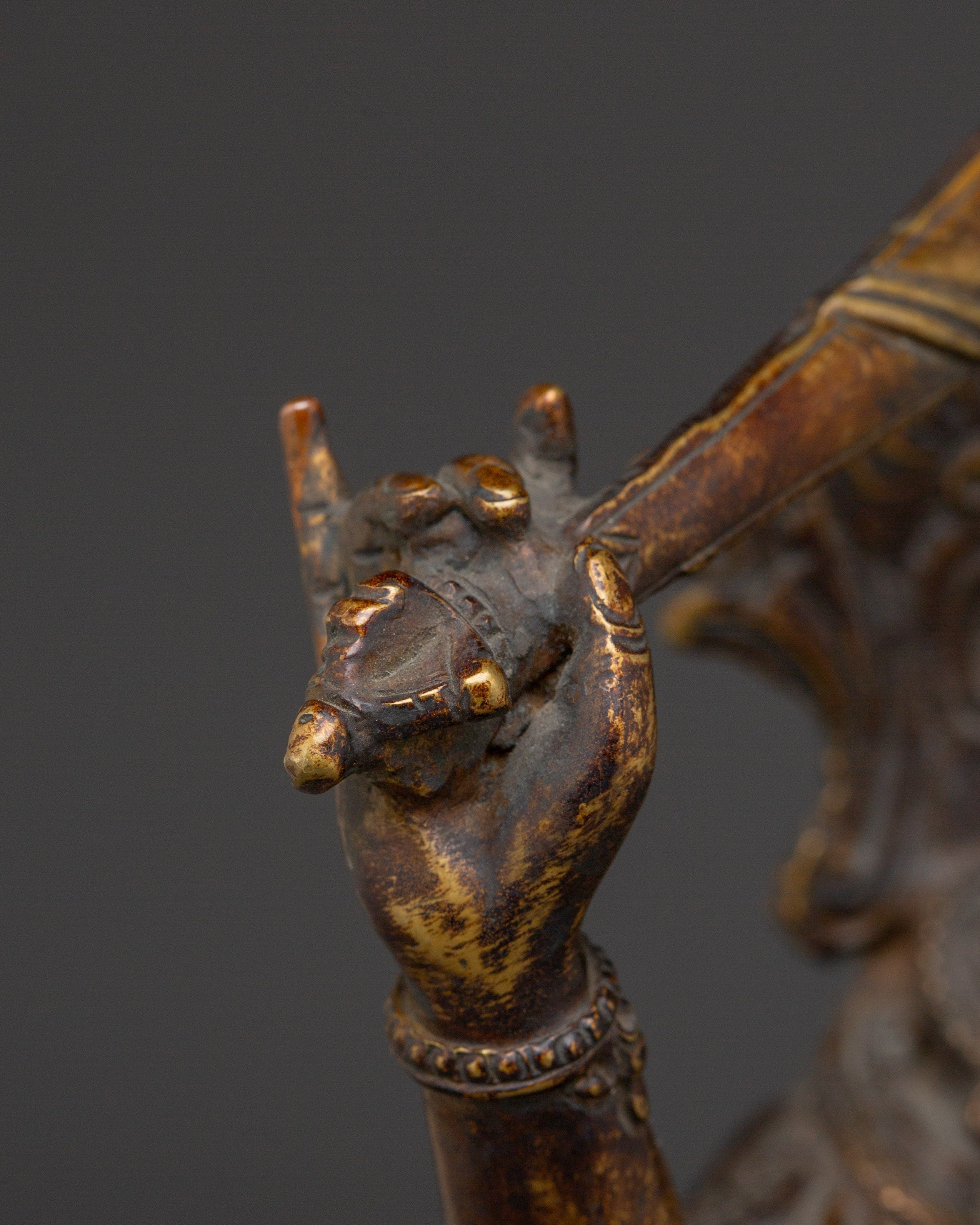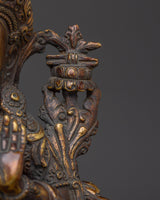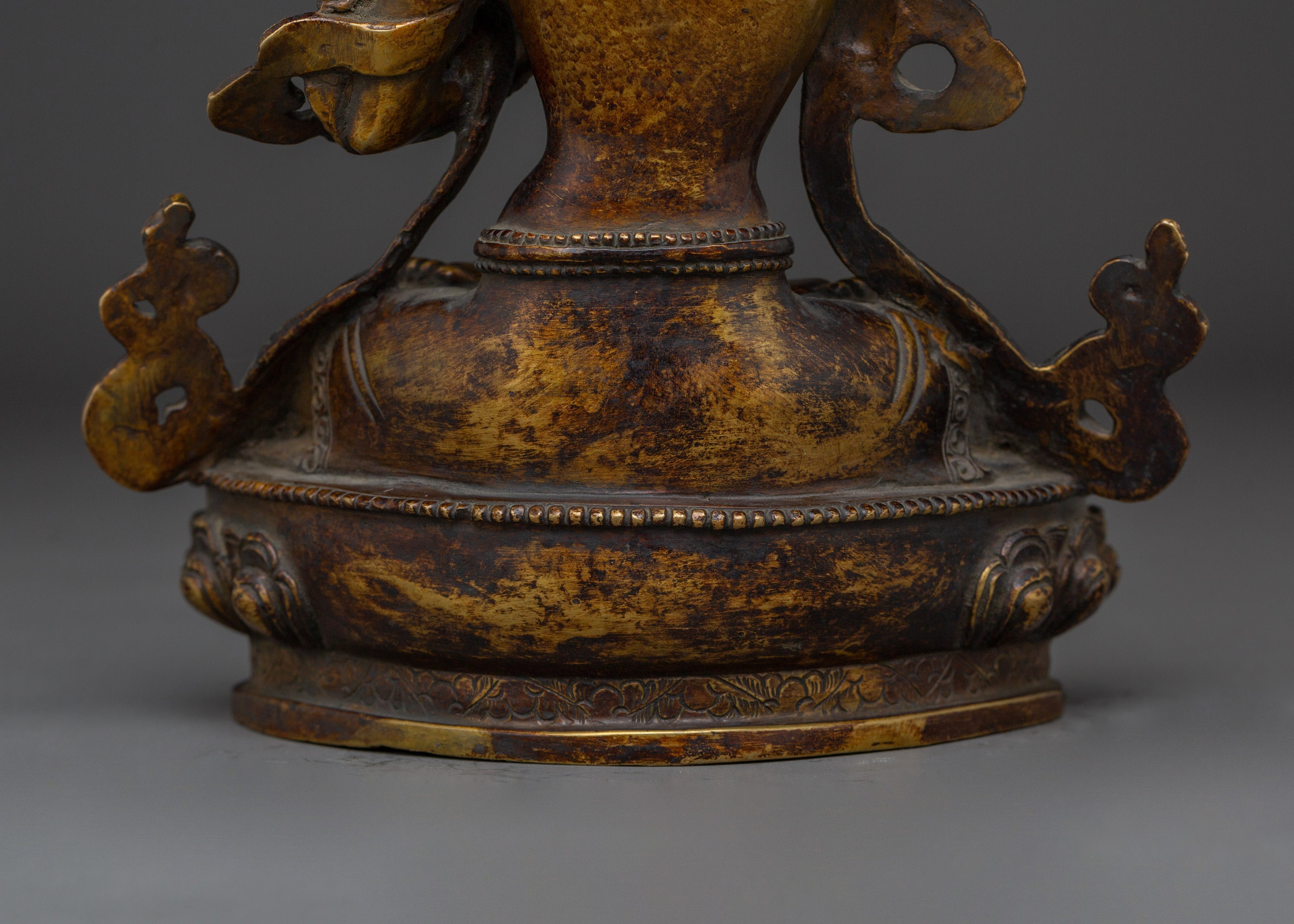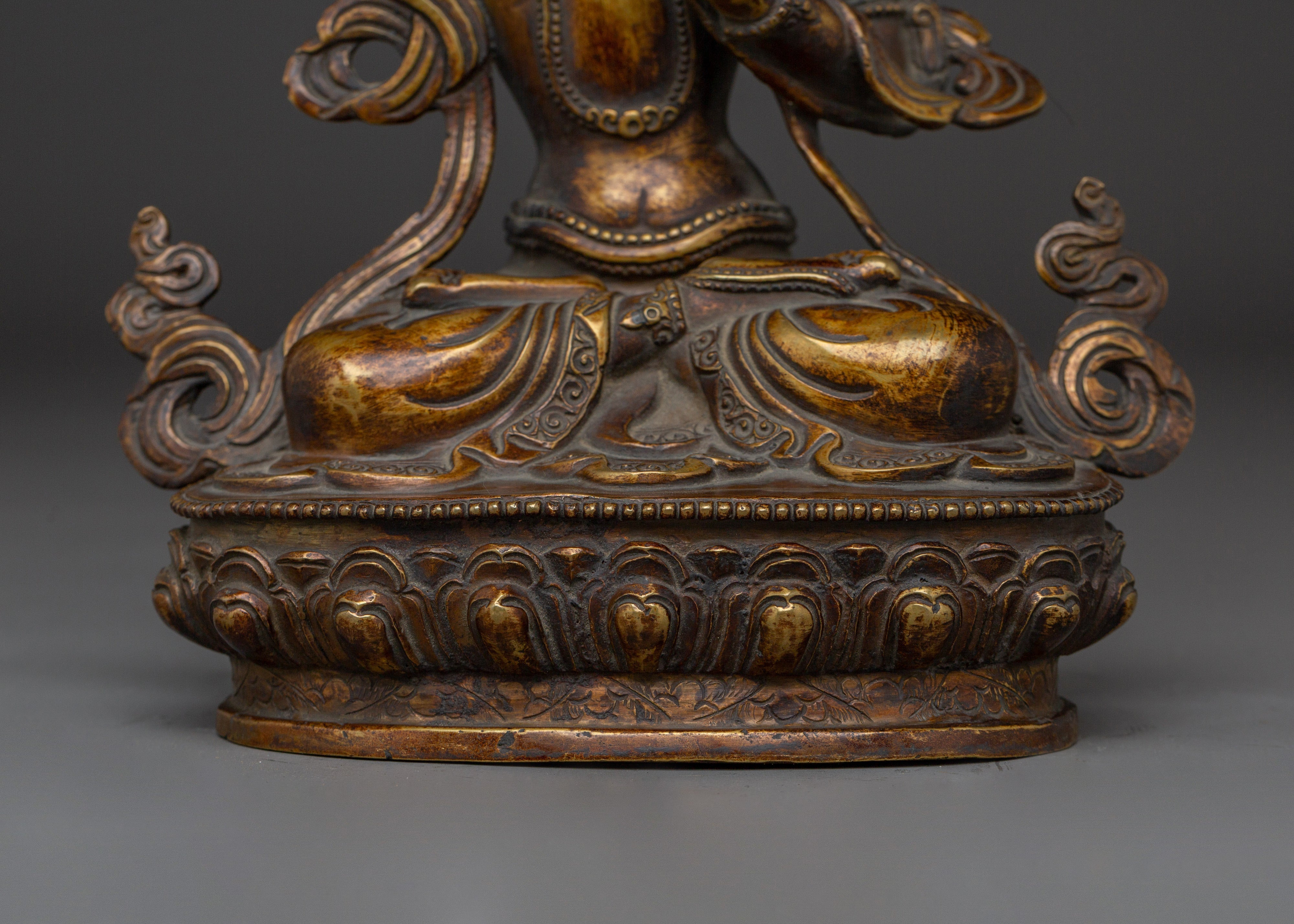 In Buddhist traditions, Manjushri, the Bodhisattva of Wisdom, is revered for his ability to cut through delusion and bring clarity. When paired with his consort, this portrayal stresses the combination of transcendent wisdom (Manjushri) and deep comprehension (Consort). They work together to guide the seeker to understand reality better, emphasizing the balance of knowledge and sensitivity. This statue serves as a beacon for anyone seeking a greater sense of themselves and the universe.