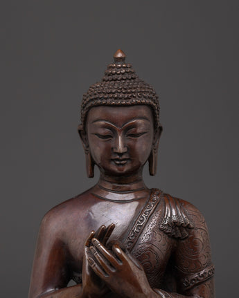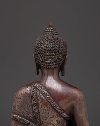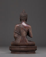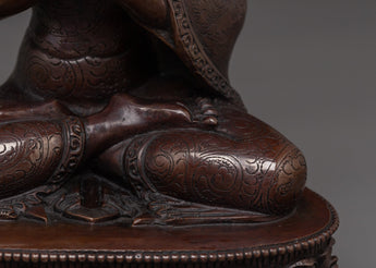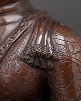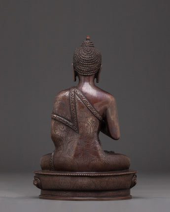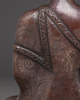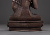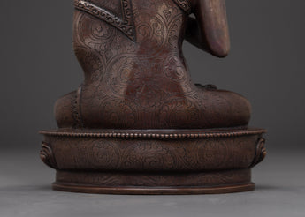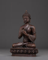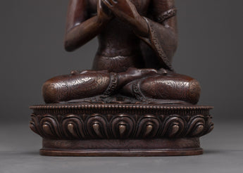 The Vajrayana Deity Vairocana statue stands 9.1 inches (23 cm) tall, with a base width of 5.9 inches (15 cm), and weighs 1.31 kilograms. Crafted meticulously from oxidized copper, the statue exudes a timeless and sacred aura through its deep, rich patina finish, which emphasizes its spiritual depth and artistic craftsmanship. This statue is a profound symbol of transcendence, wisdom, and spiritual illumination—an inspiring addition for practitioners and collectors alike.
